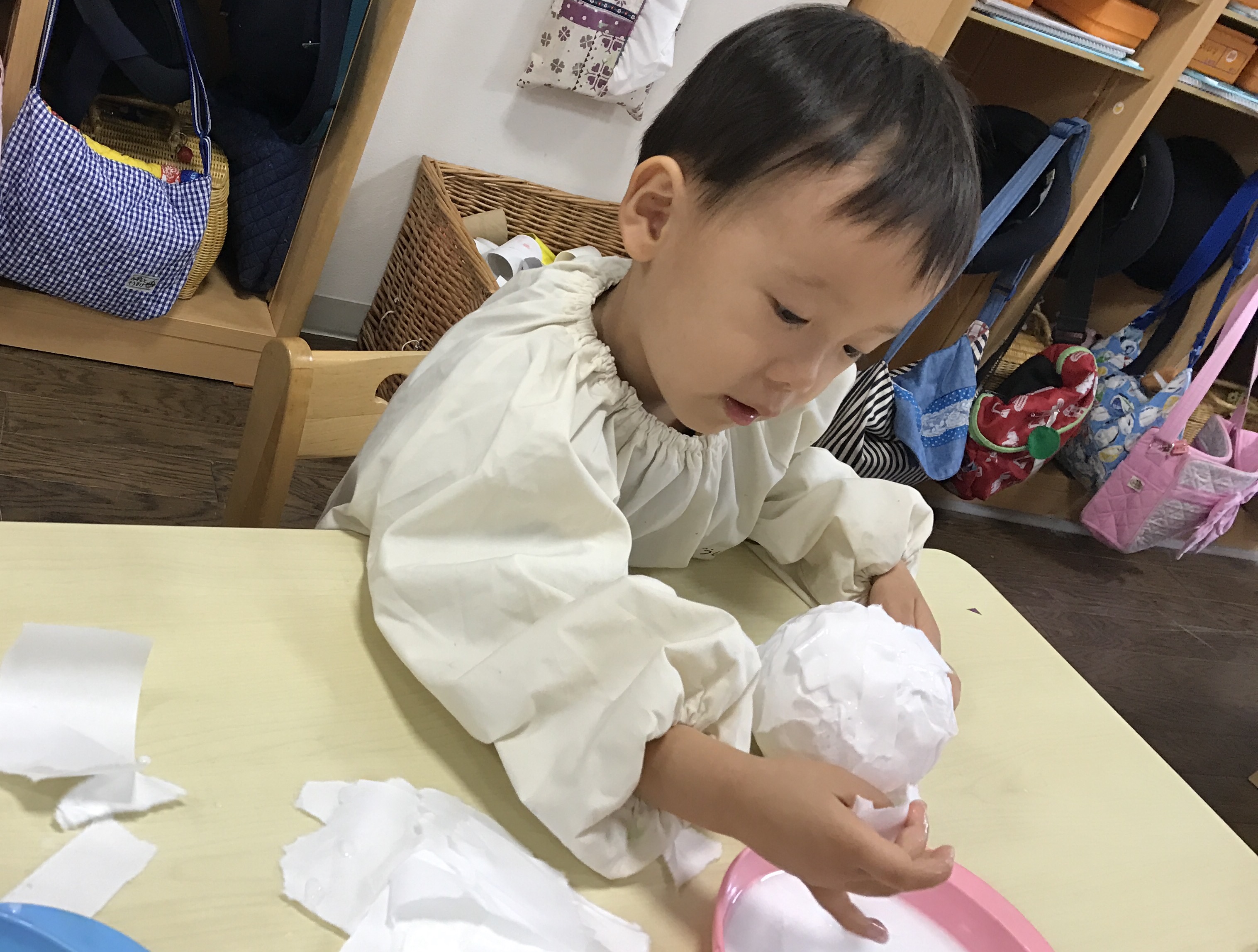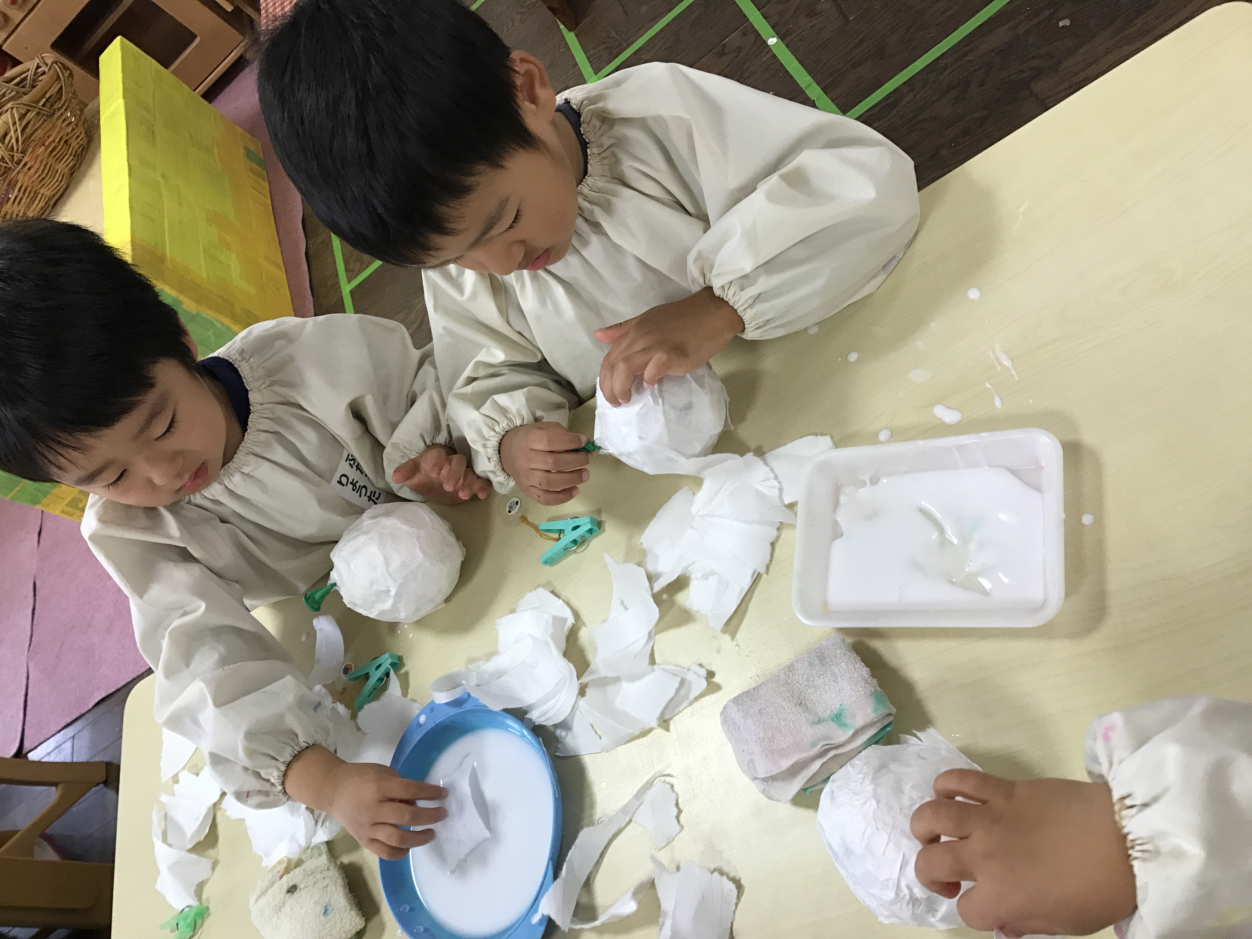 ゆり組では、先週から風船に和紙を貼り『りんご』作りをしています。