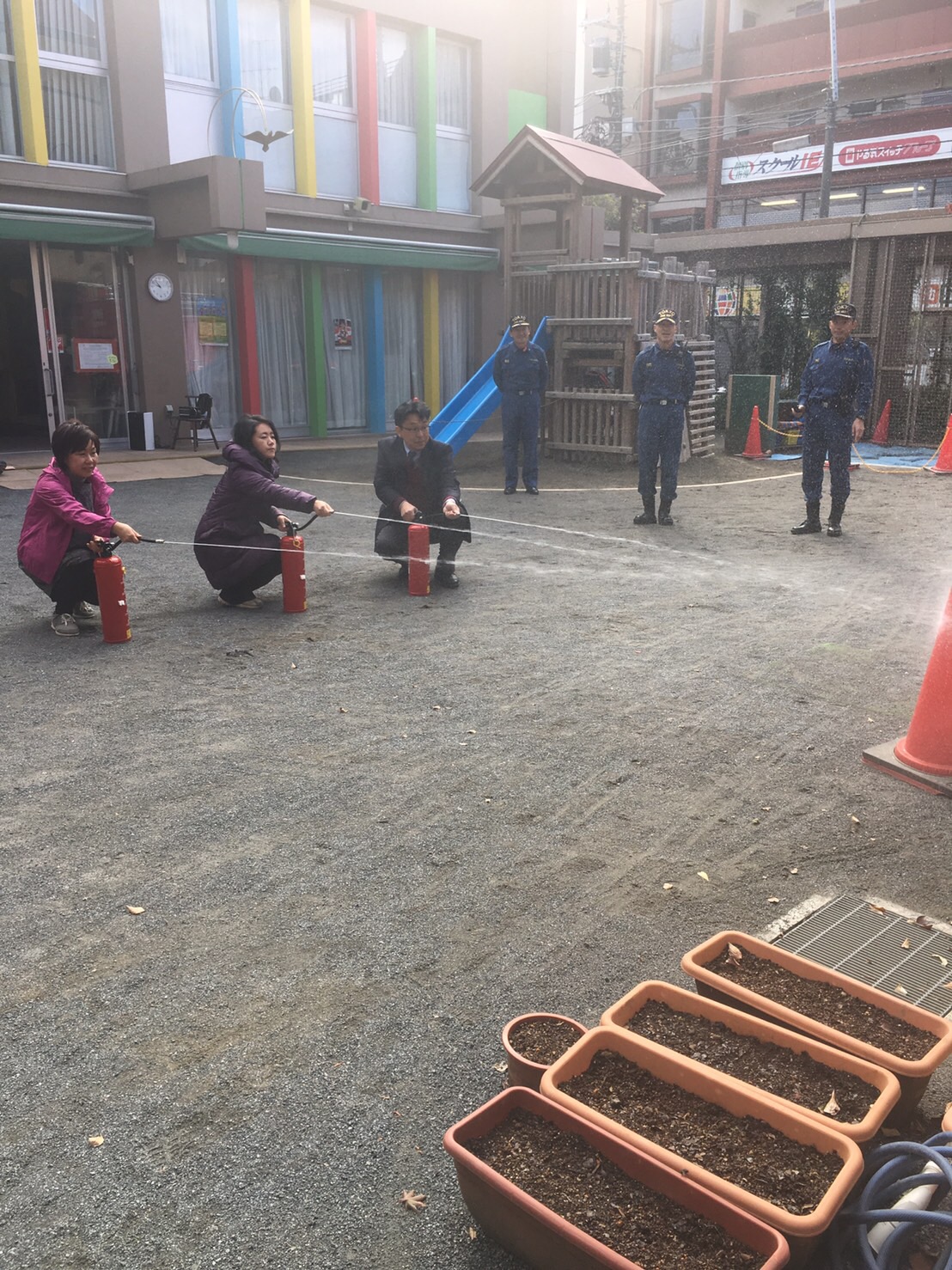 先生たちが消火訓練をすると、「先生頑張って!」