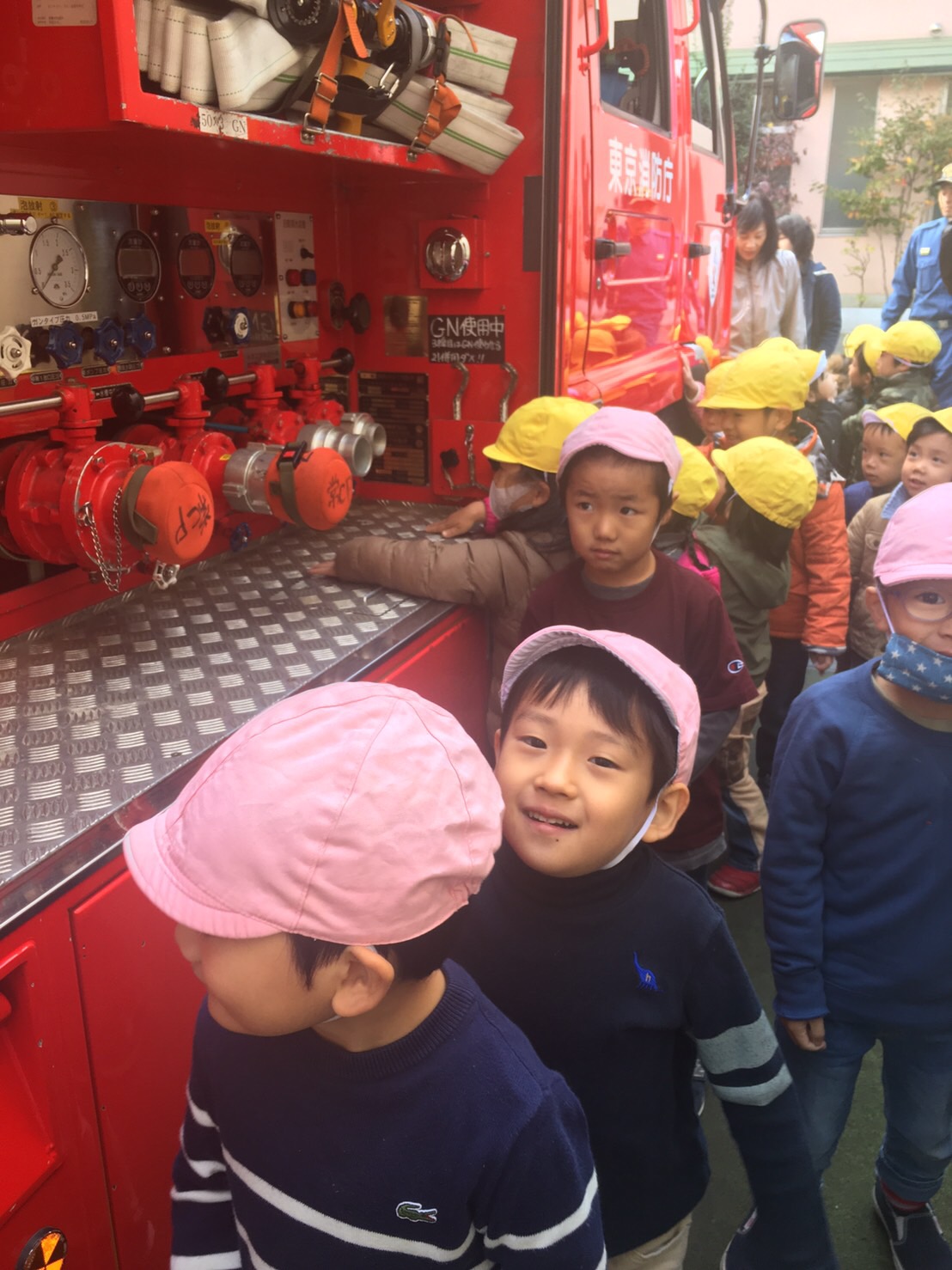 「幼稚園に消防自動車が来た!」朝から大喜びの子どもたちです。