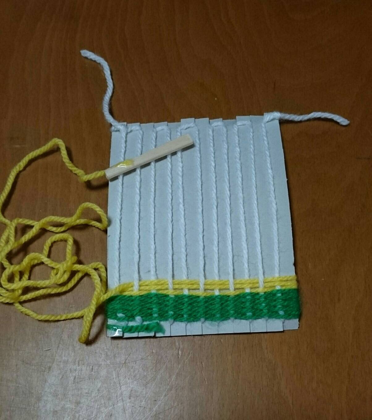 「上、下次は下、上」一段ずつ確認しながら織っていきます。慣れてくると間違いに気付き、自分で直す事も出来るようになりました。登園後、お弁当後に少しずつ進めているお友だち、楽しくて夢中になっているお友だち。一人一人が仕上がりを楽しみにしながら取り組んでいます。