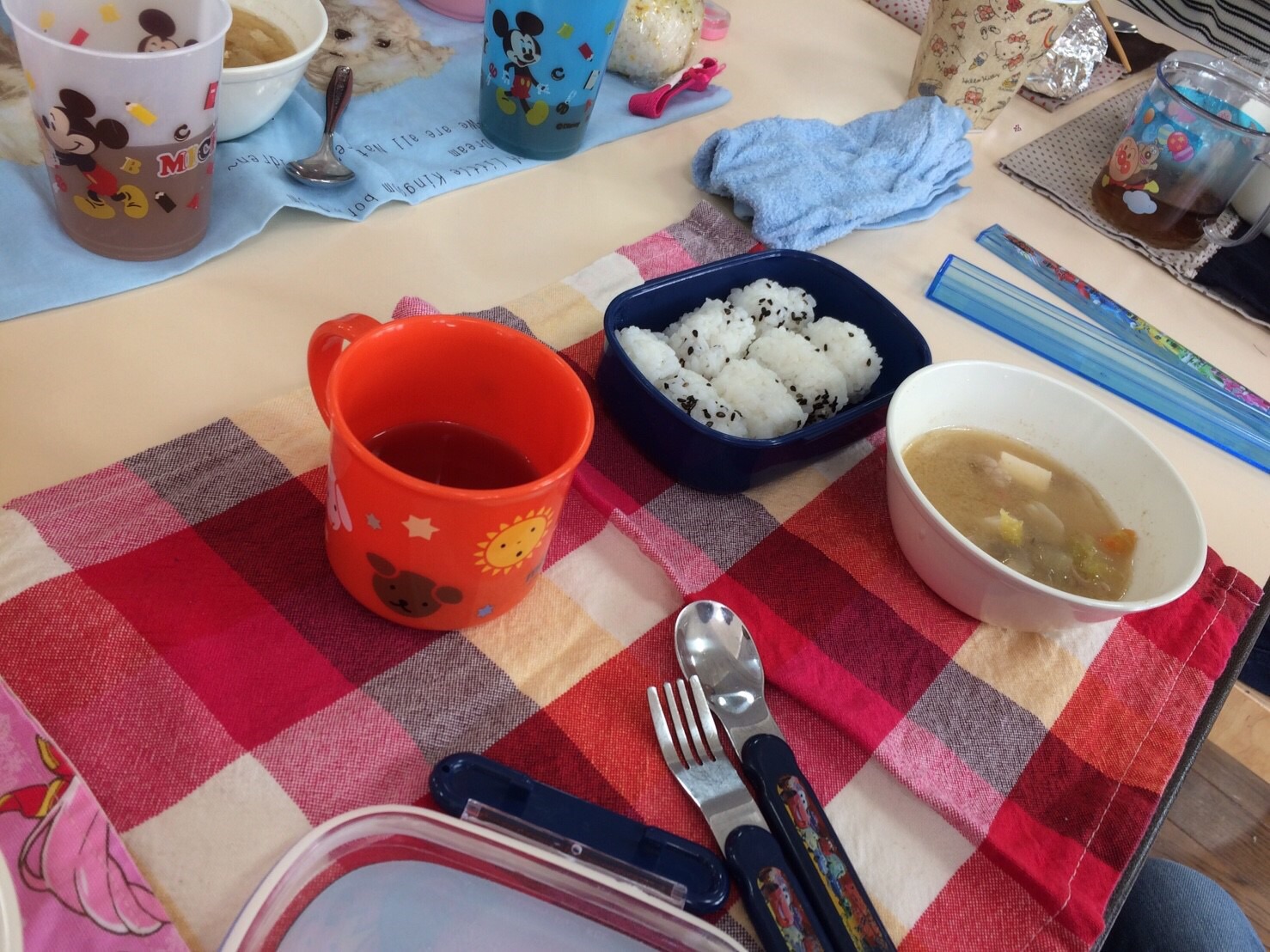 今日のもも組は、ランチパーティーでした。おにぎり、豚汁、ゼリーをみんなでいただきました。みんなで食べると美味しいですね。
