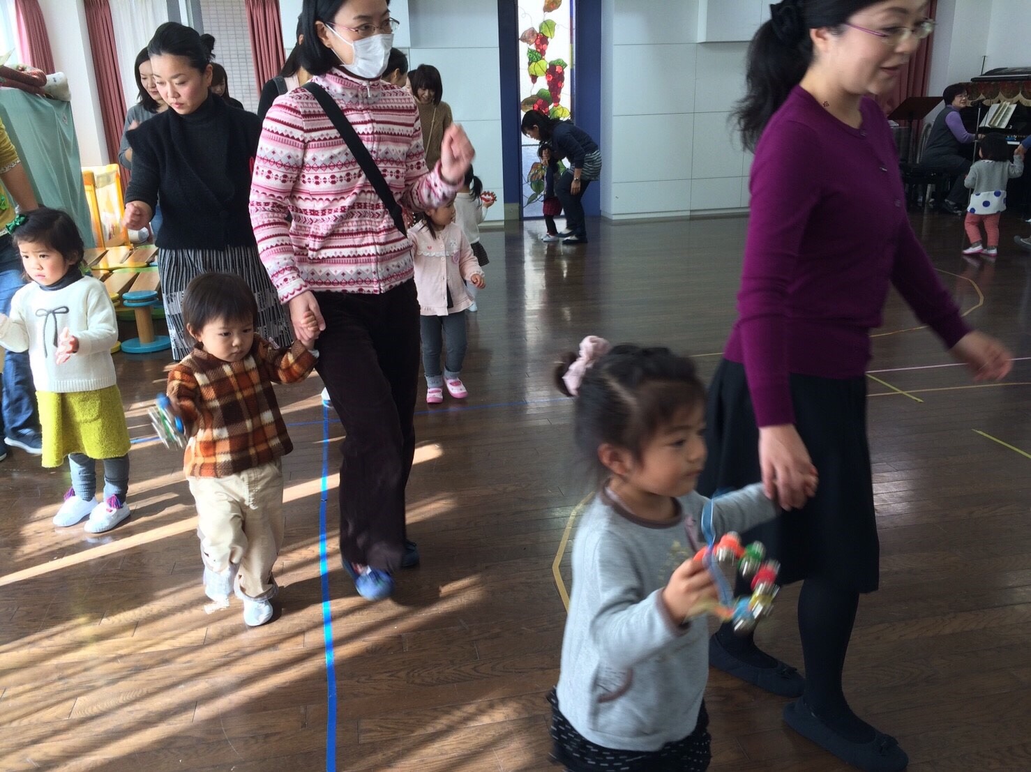 鈴をピアノのリズムに合わせて鳴らす楽器遊び。とても上手になって来ました。