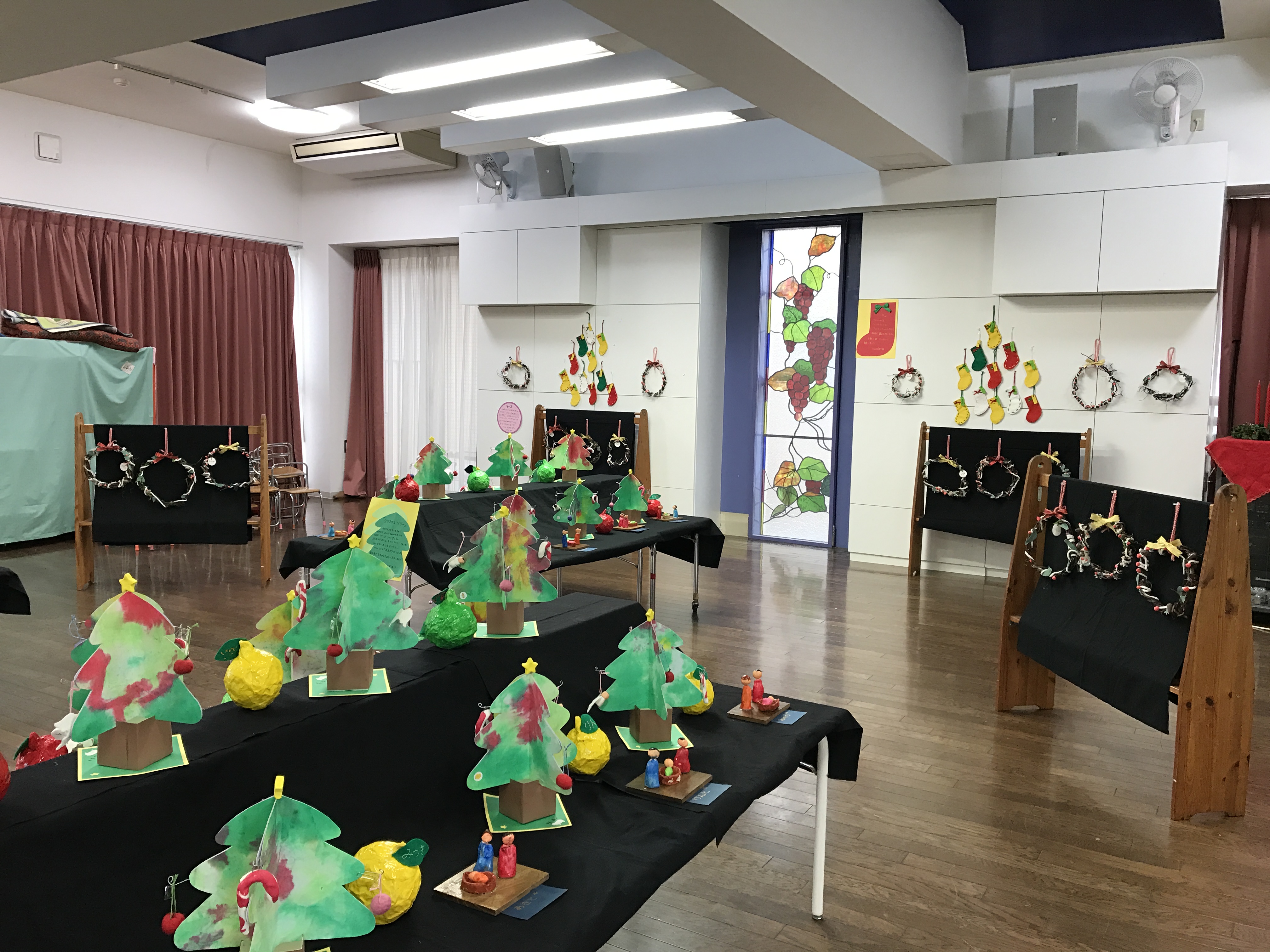 子どもたちもページェントの練習をしているので、『演じる』ことに関心があるのと、お母様方の一生懸命な姿に引き込まれ、暖かい気持ちを持ったまま、クリスマスの作品展をおうちの方々に見ていただきました。