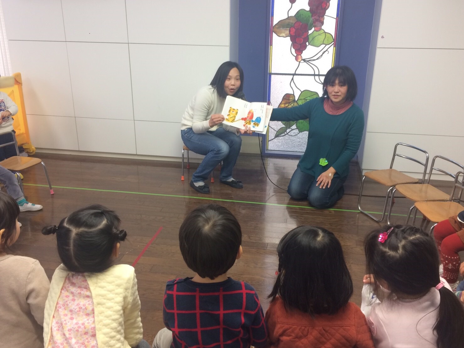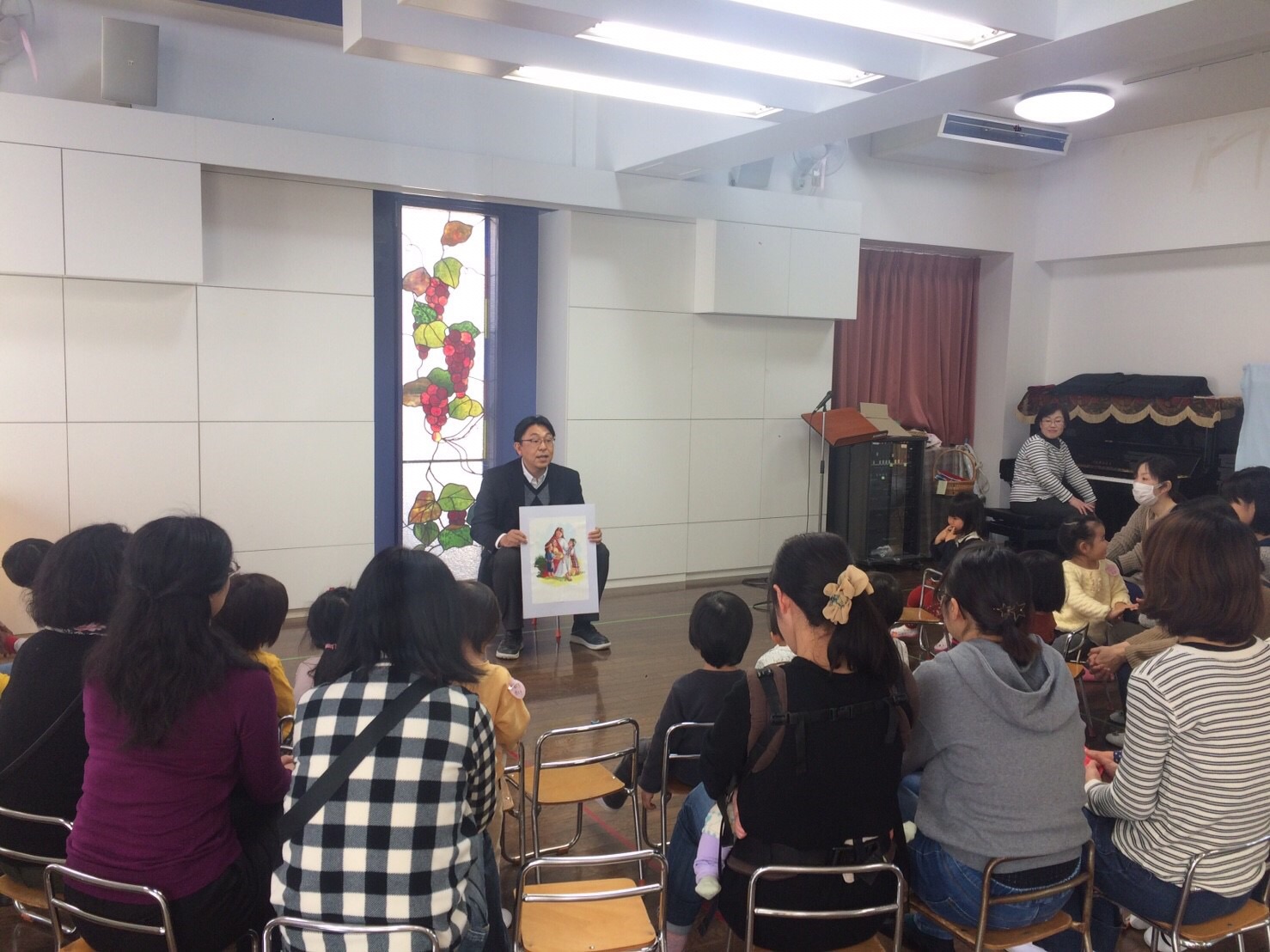 最後はおうちの方も一緒にお帰りの会。ちょっとホッとした子どもたちとおうちの方に園長先生がお話をしてくださり、みんなで「主 我を愛す」の讃美歌を歌いました。