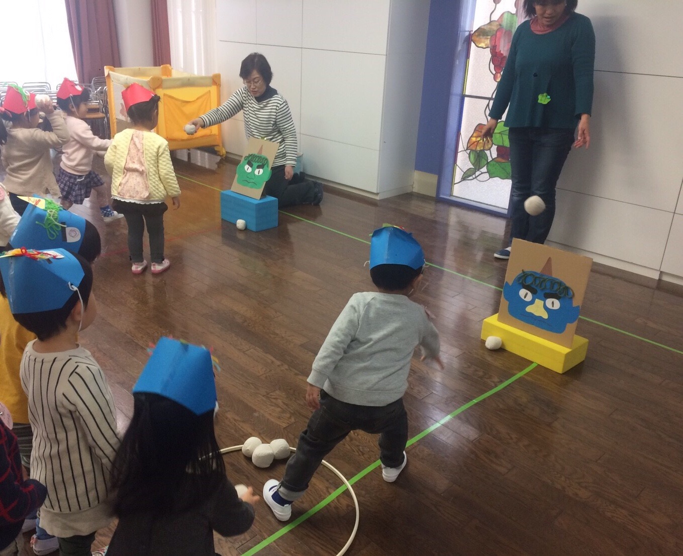 その間子どもたちは、体操をして、先週作った鬼の帽子をかぶり、鬼退治に出発!的あてゲームを楽しみました。みんなが力いっぱい鬼に向かって白い玉を投げ、鬼は逃げていきました。