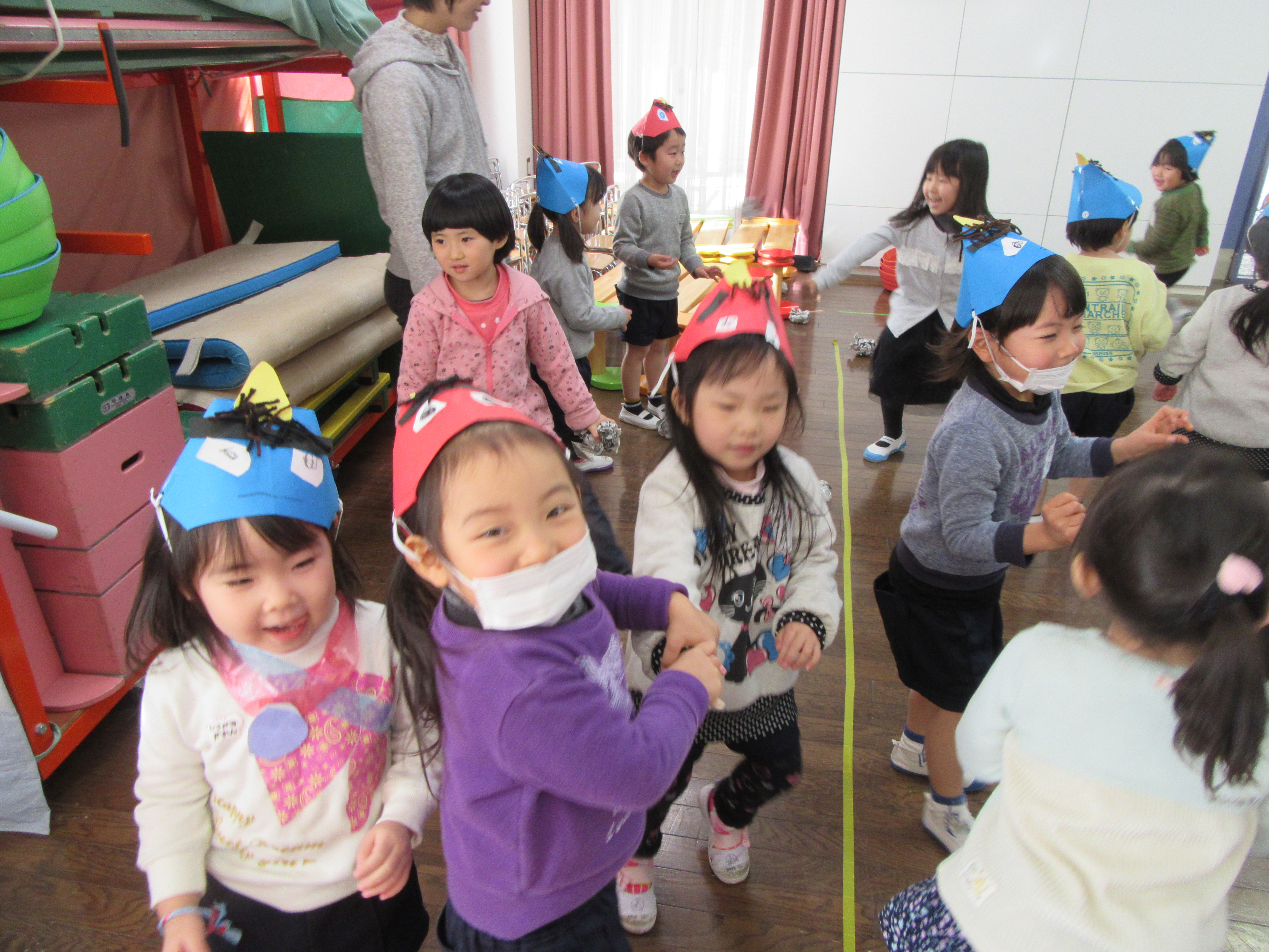ホールで「鬼退治ごっこ」をしました。