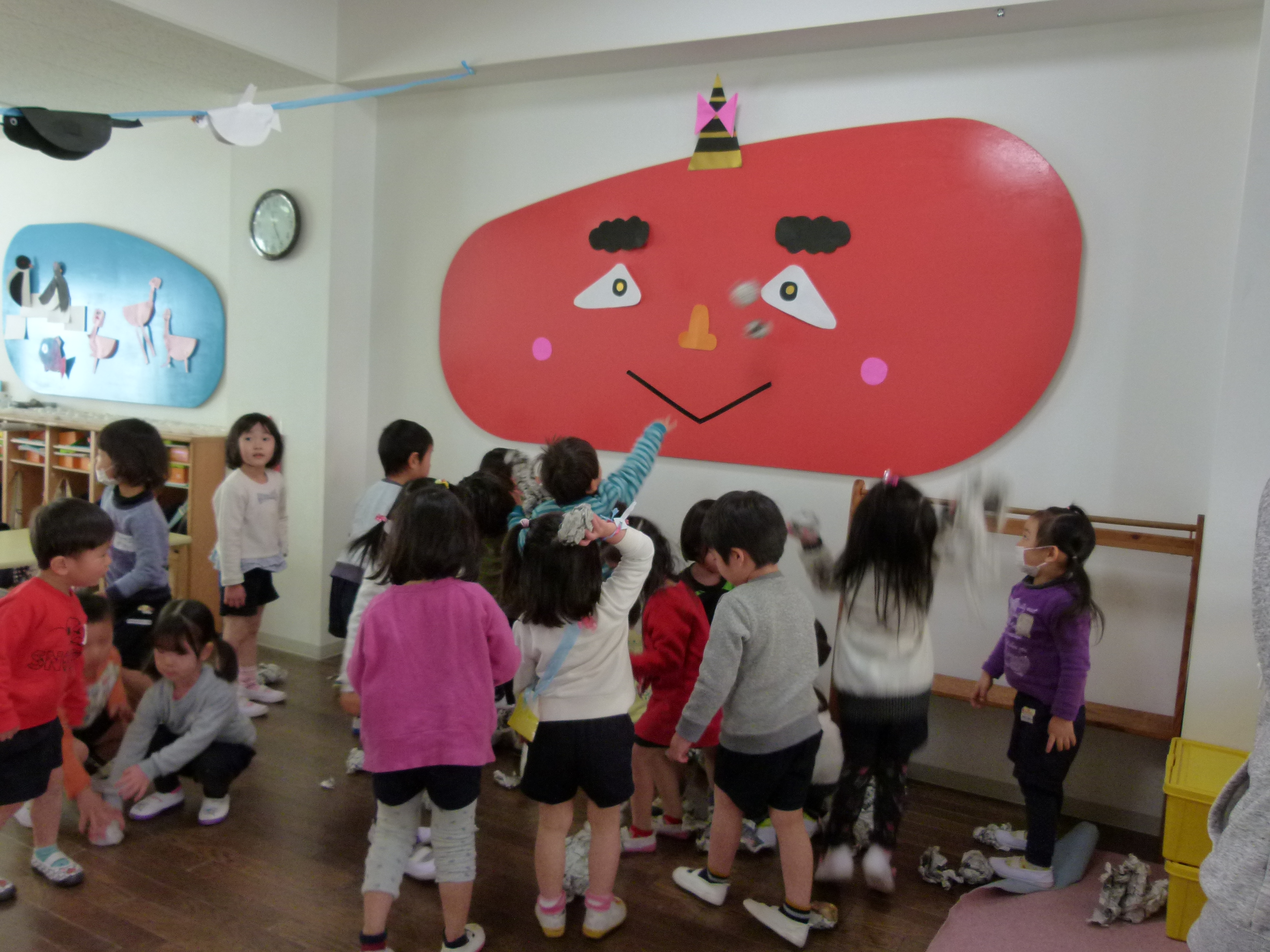 そして、たんぽぽ組の壁面に現れた赤鬼に向かって、新聞紙で作った豆をまきましました。怖い顔していた鬼が、最後には、心を入れ替えて優しい鬼に…。