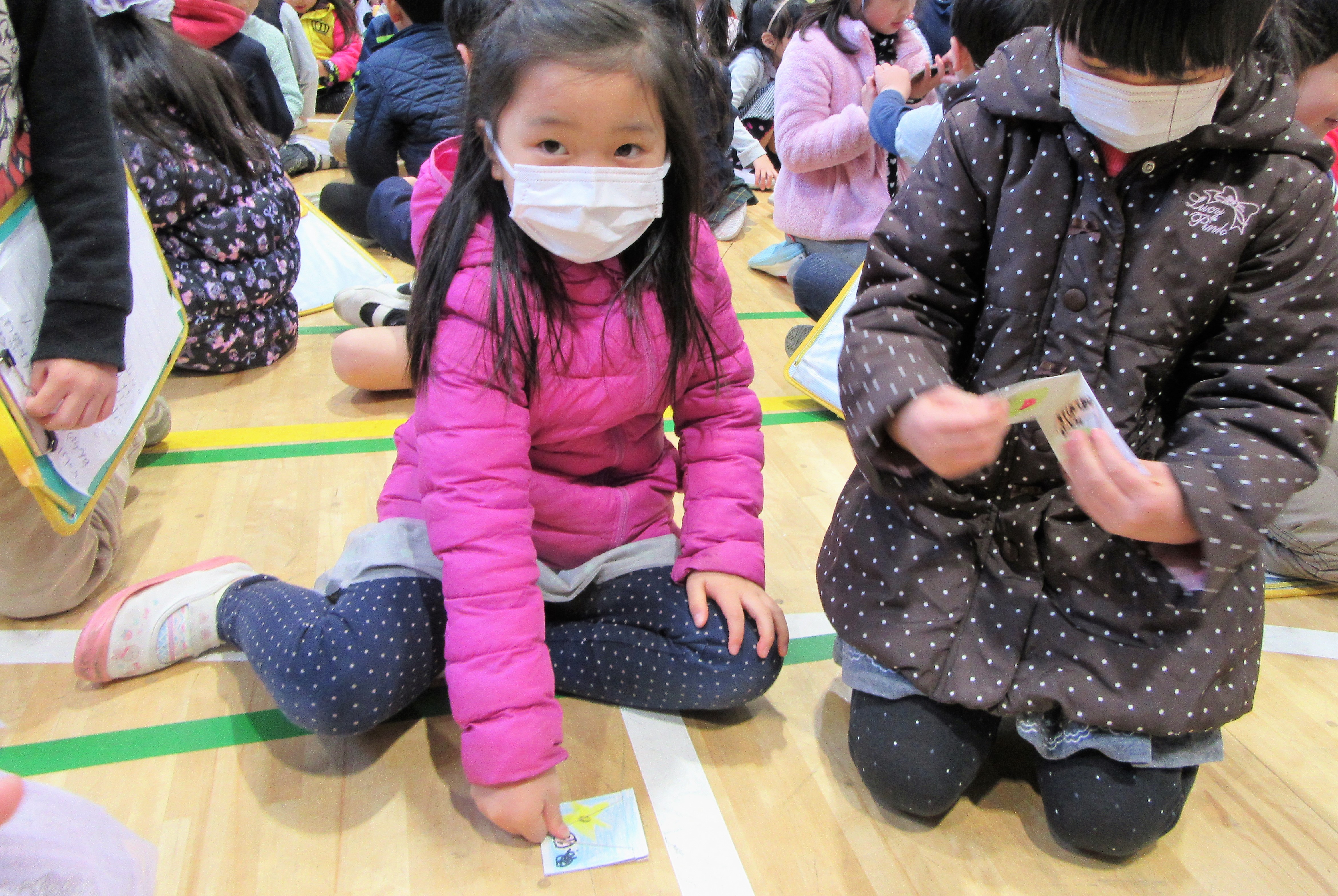 体育館では全1年生、先生方、他園のお友達とクイズやゲーム等を楽しみました。プレゼントとして頂いた手作りの”ピョンピョンガエル”は大事にお家へ持って帰りました。