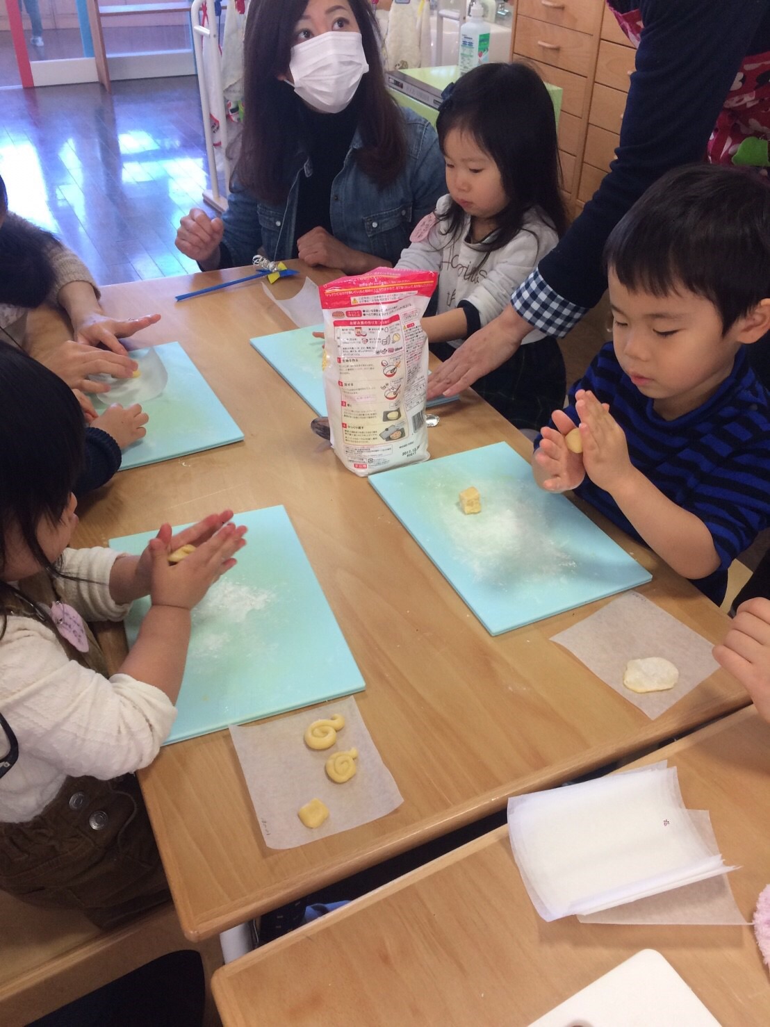 今日はクッキング。おうちの方と一緒にクッキーの生地を好きな形にしました。うさぎさん、車の形、へびさん、ハート。。。オーブンに入れると、クッキーの焼けるいいにおいがお部屋中に広がりました。