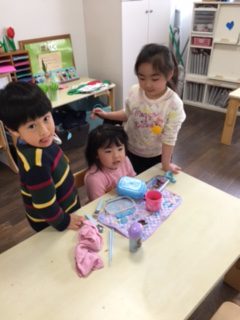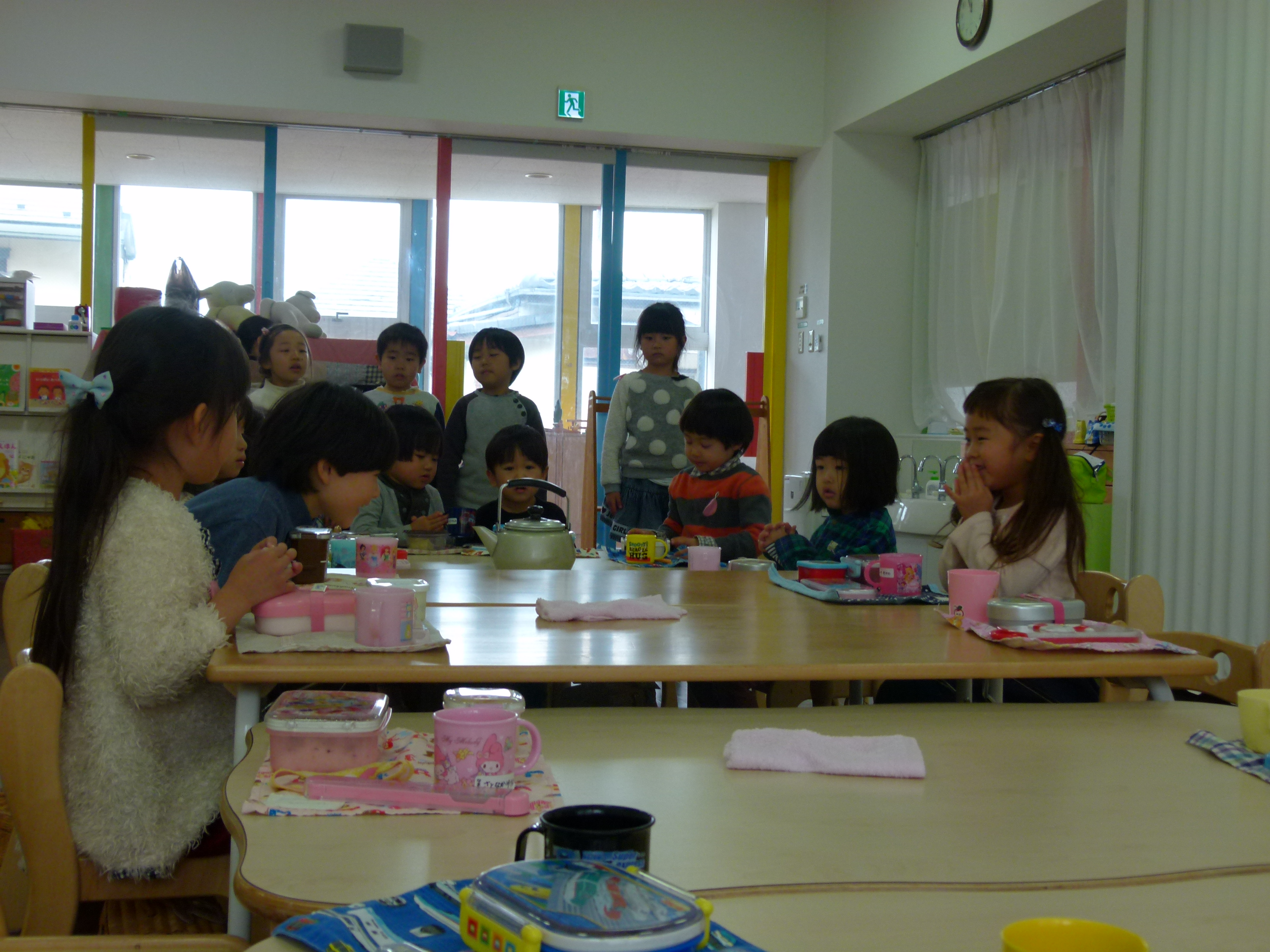 お弁当を食べた後は、おにいさん、おねえさんが、ゆり組さんのお片づけを、お手伝いしたり