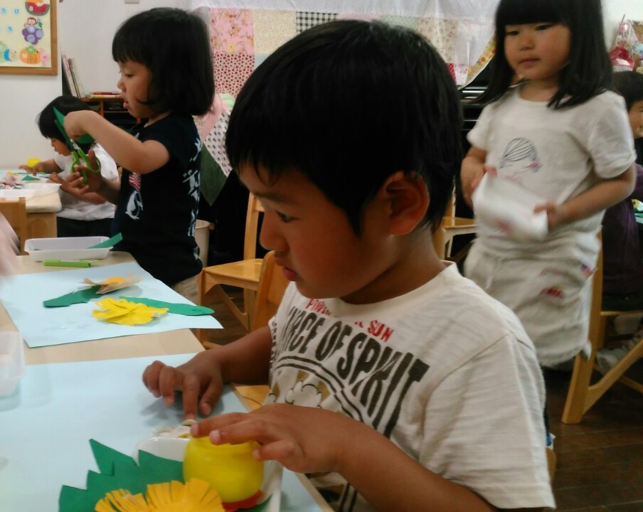 たんぽぽ組は先週からたんぽぽのお花を製作していました。お花は折り紙、葉は画用紙を切りました。