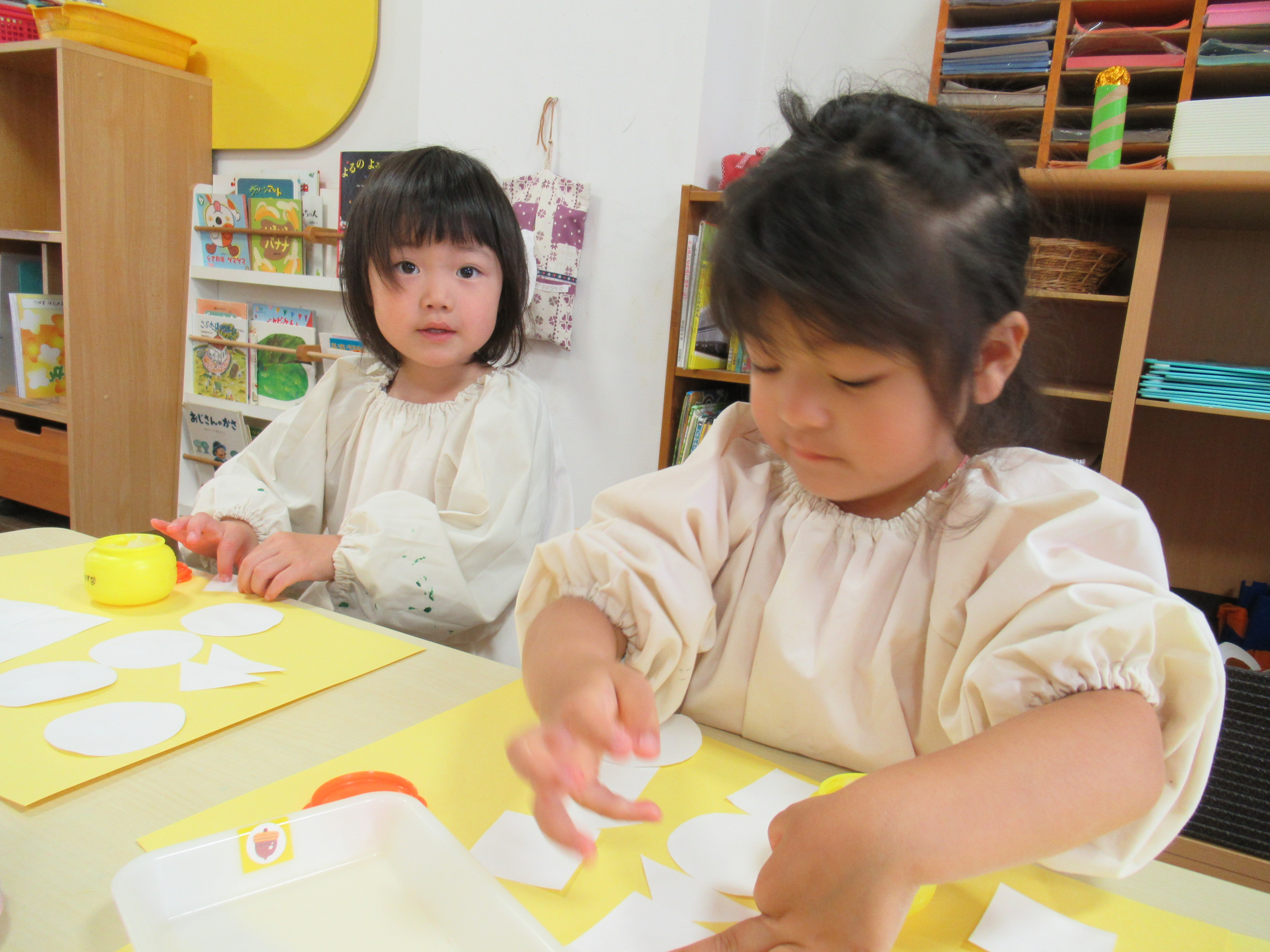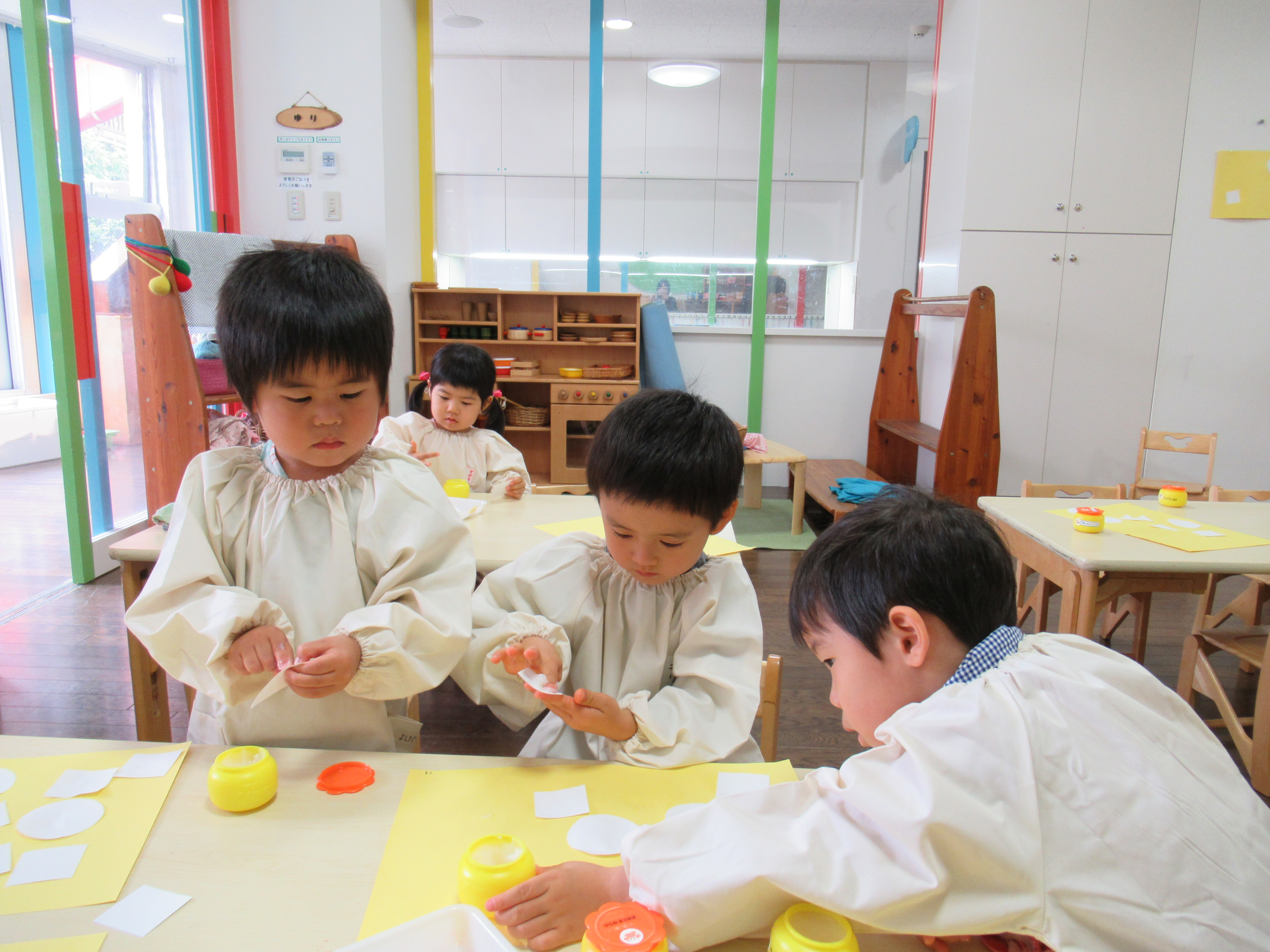 ゆり組 のりを使って製作をしました! 今日のひとこま 2017.05.15 今日は、先週に比べて少し気温も低く、肌寒い日でした。 ゆり組はのりを使った製作をしました。「のりは強いから、少しの量でくっつよ〜」と声をかけると、上手にのりを少量とって貼り付けていました。 明日はこれにクレヨンで色をつけたり、絵を描いたりします!どんなものを描くのか楽しみです。
