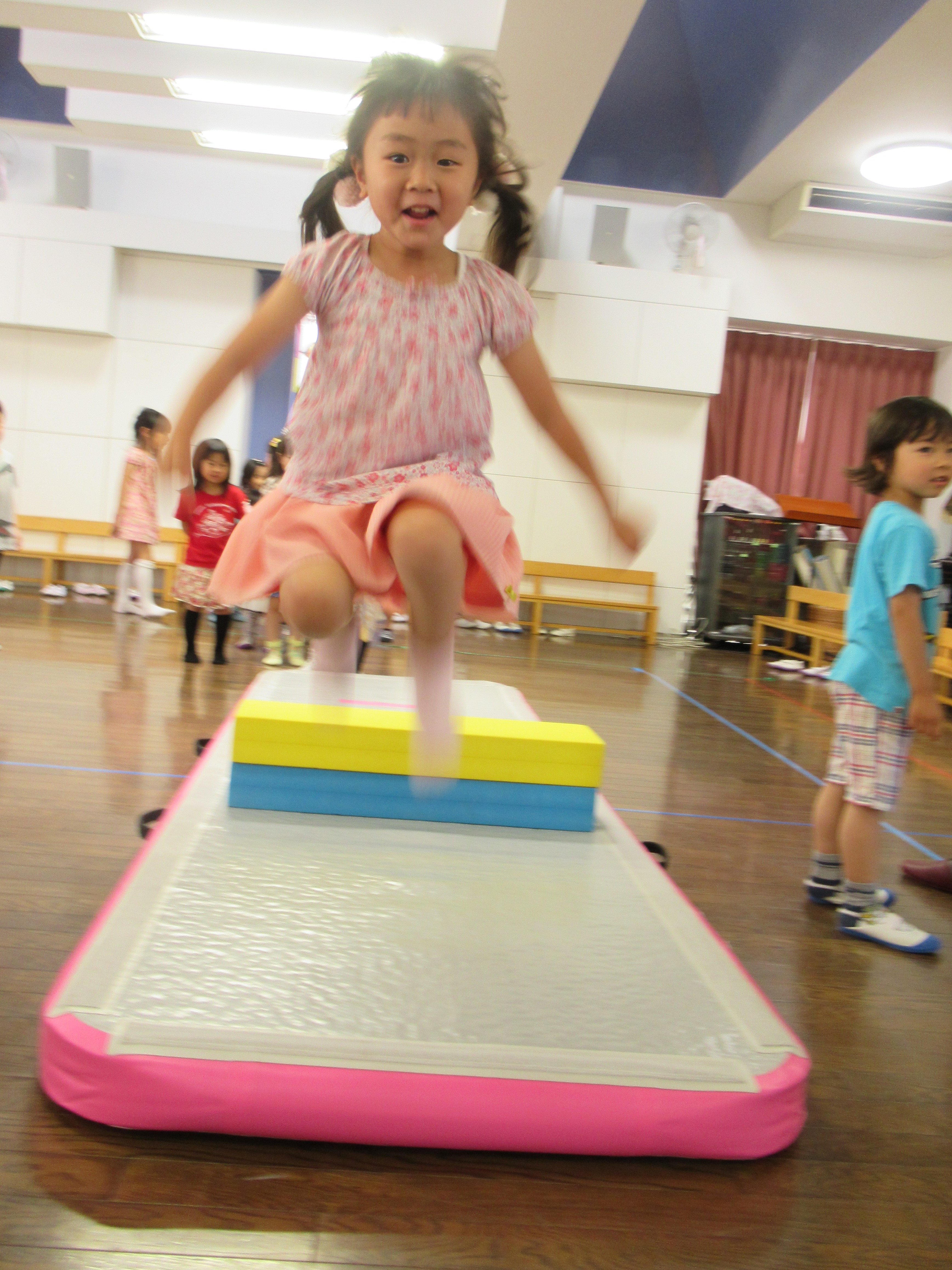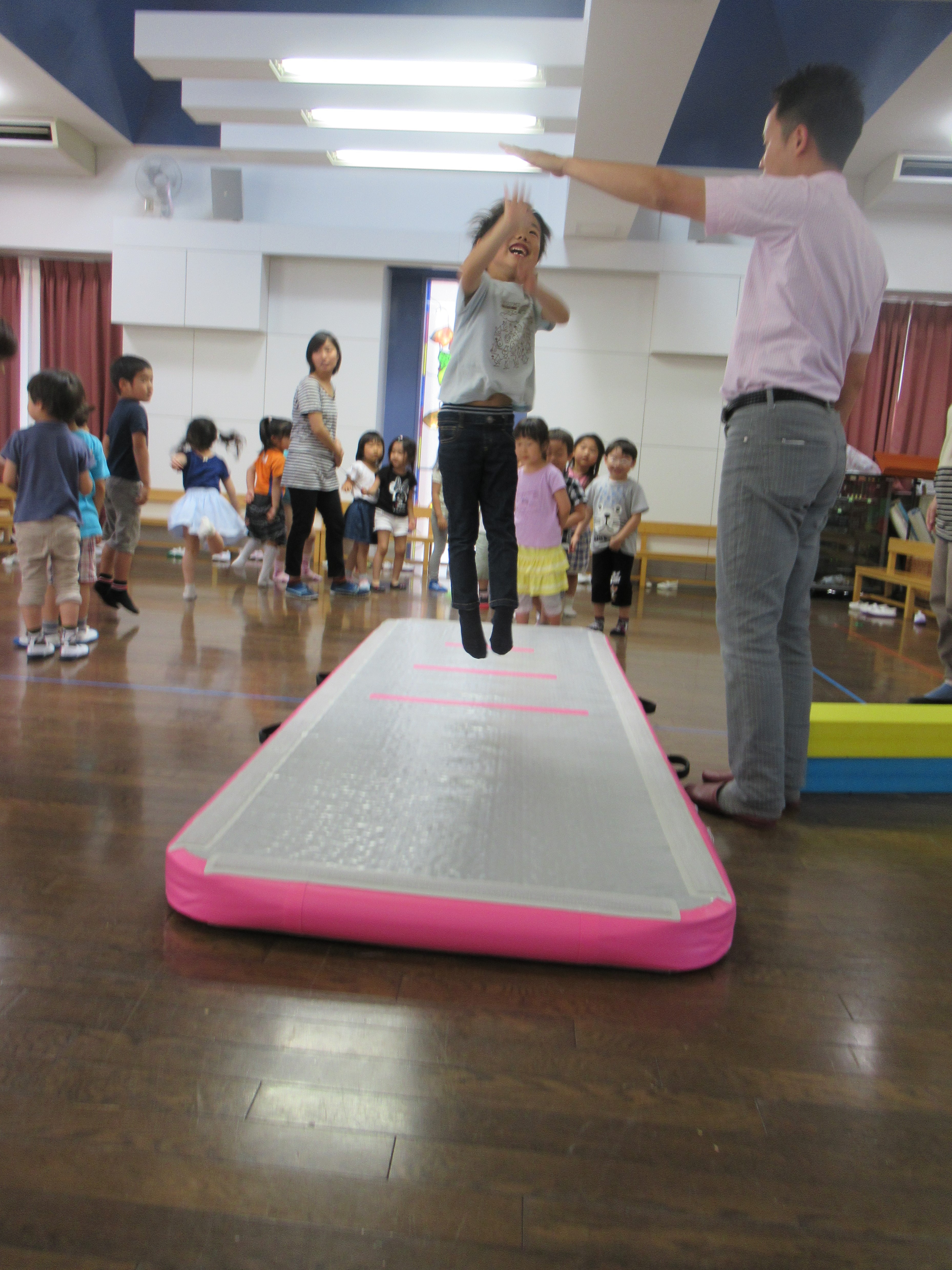 このトランポリンは、自分のジャンプする力で、弾み方が変化します。 たくさん体験する中で、自分自身の様々な力が養われていくことでしょう。