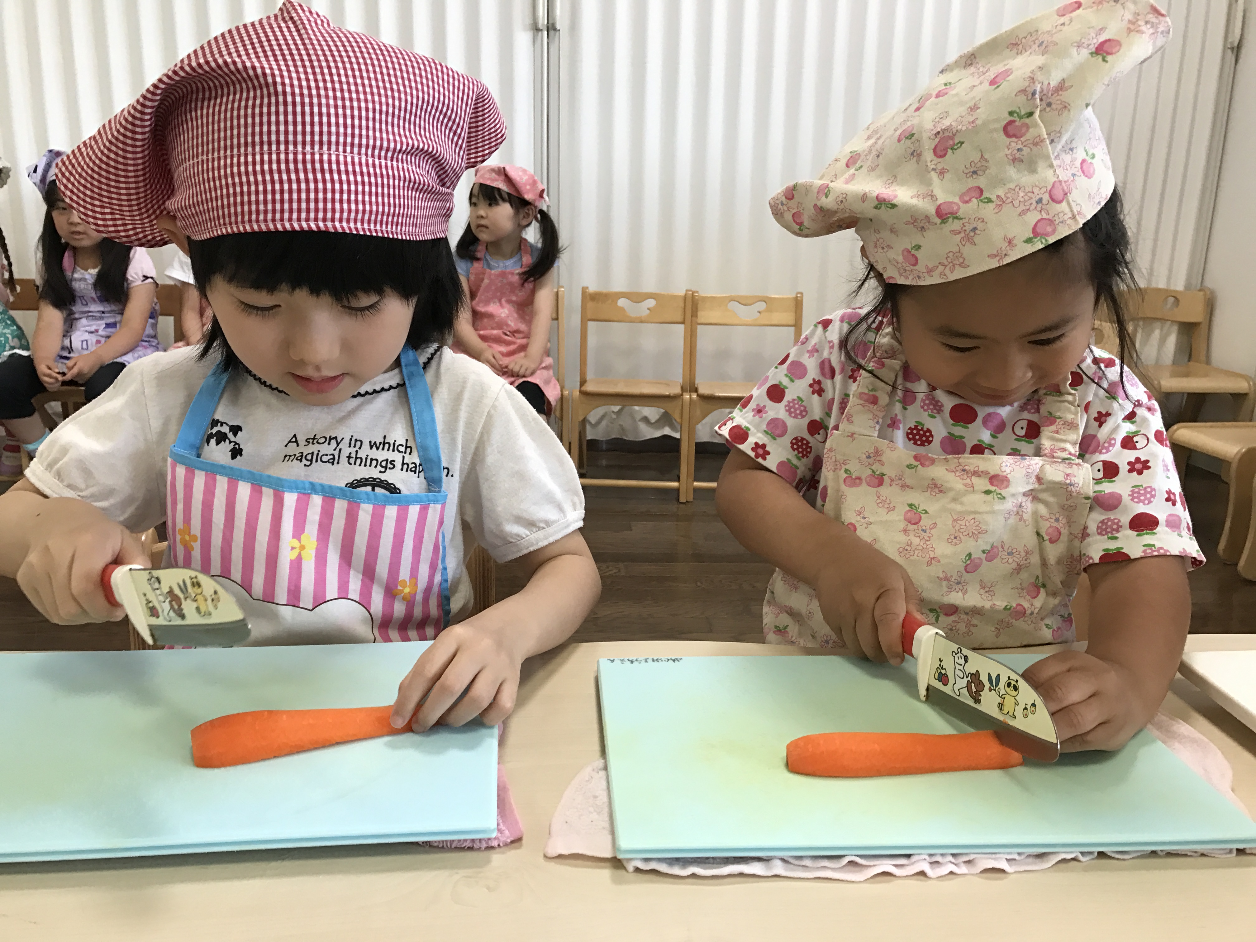 それぞれエプロン・三角巾を着けるのも慣れて、調理する手つきも上手くなってきました。