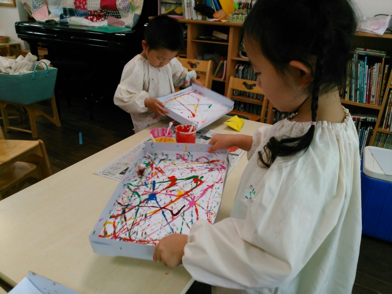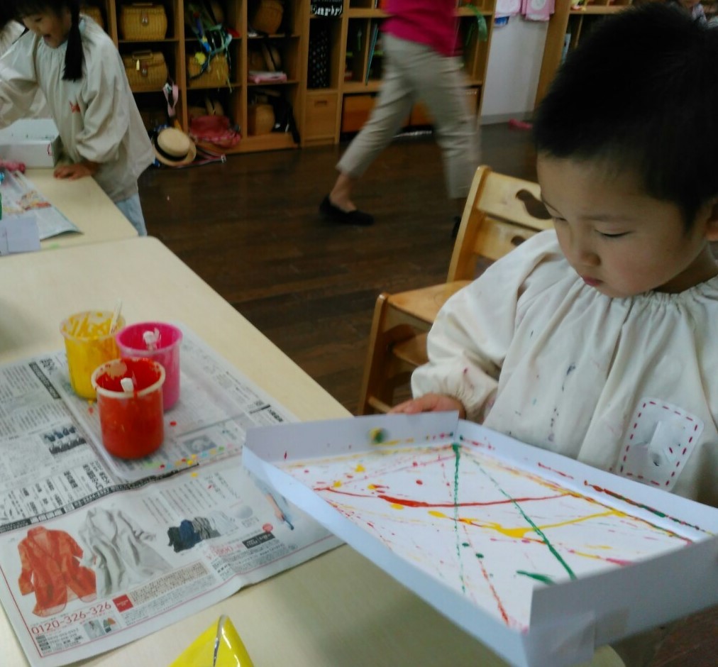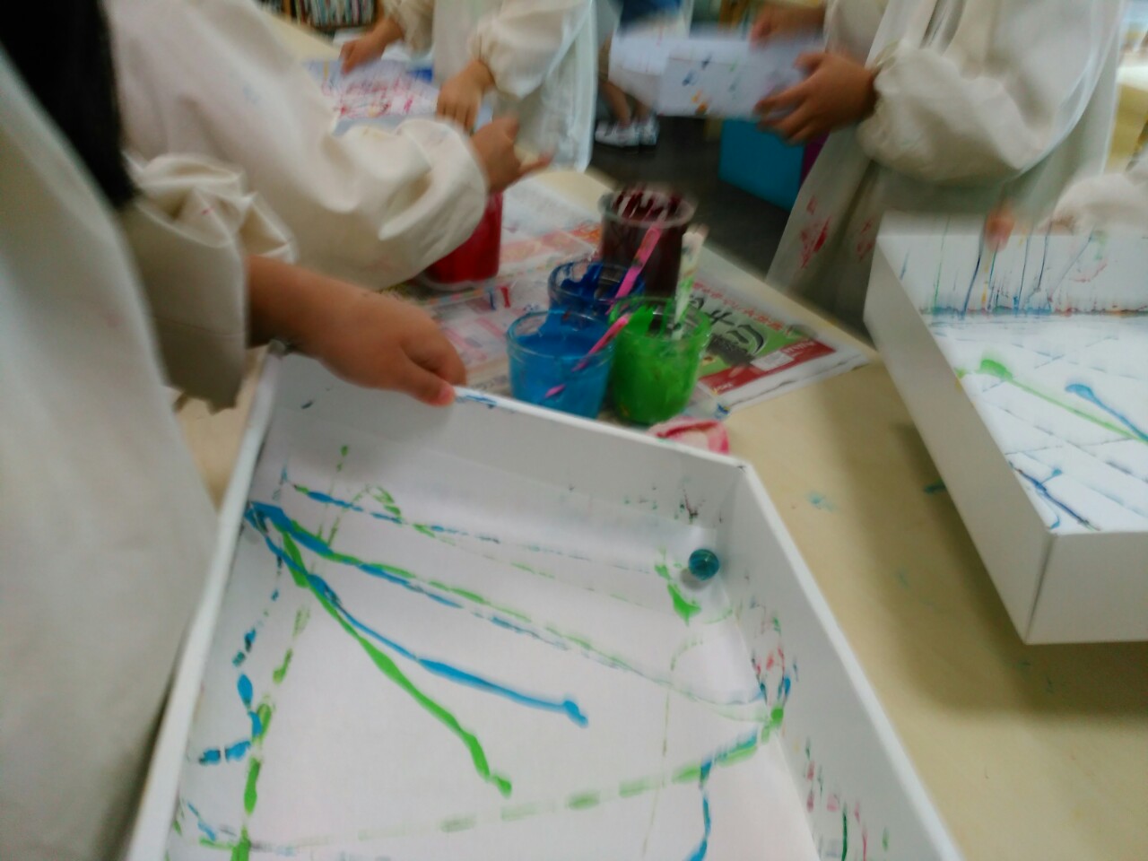 ビー玉転がし 今日のひとこま 2017.06.19 たんぽぽ組のお友だちはビー玉を使って遊ぶのが大好きです。 いつもはおままごとでご飯やお茶になったり、ブロックや積み木を組み立て、転がして遊んでいるビー玉に絵の具を付けて箱の中で転がしてみました。 「うゎー、迷路みたい」と言いながらゆっくり、また素早く転が す事に夢中になっていました。何種類もの色が混ざり合い、偶然できる世界で1つしかない模様ができました。