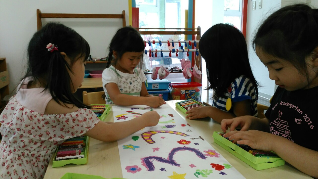 みんなで相談をして「ろうそくやさん」と「バナナケーキやさん」の看板を作りました。「かわいくできたねぇ」と大満足の子どもたちです。