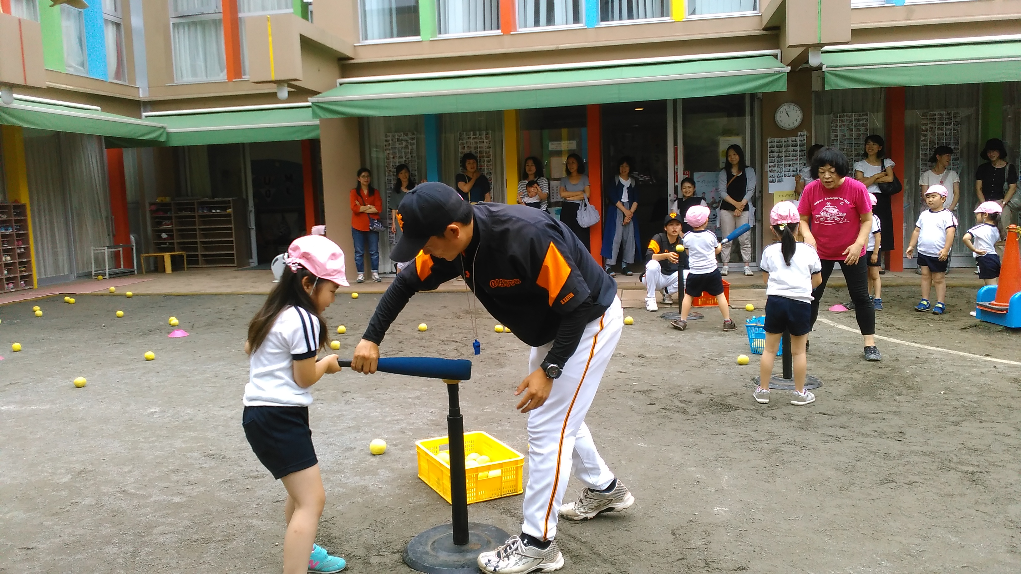 バッティングと投球をコーチから指導して頂きました。未来の野球選手が、めぐみ幼稚園からでるかもしれませんね⁉︎