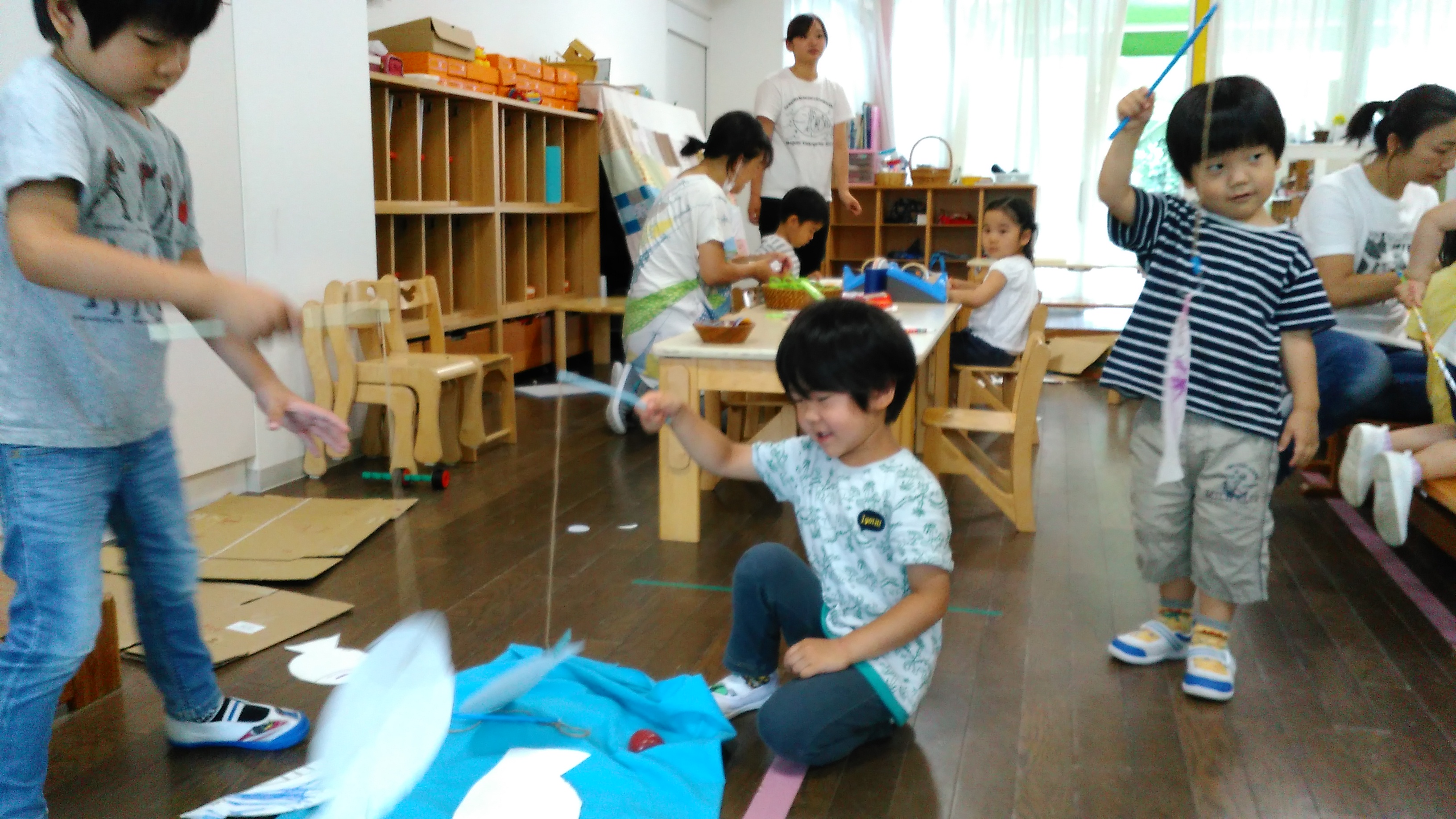 ゆり組では朝の自由時間に魚釣りのおもちゃ製作を楽しんでいる子どもたちがいました。魚に色や模様を描き、はさみを上手に使って切り…作った魚で魚釣りをして遊んでいました!