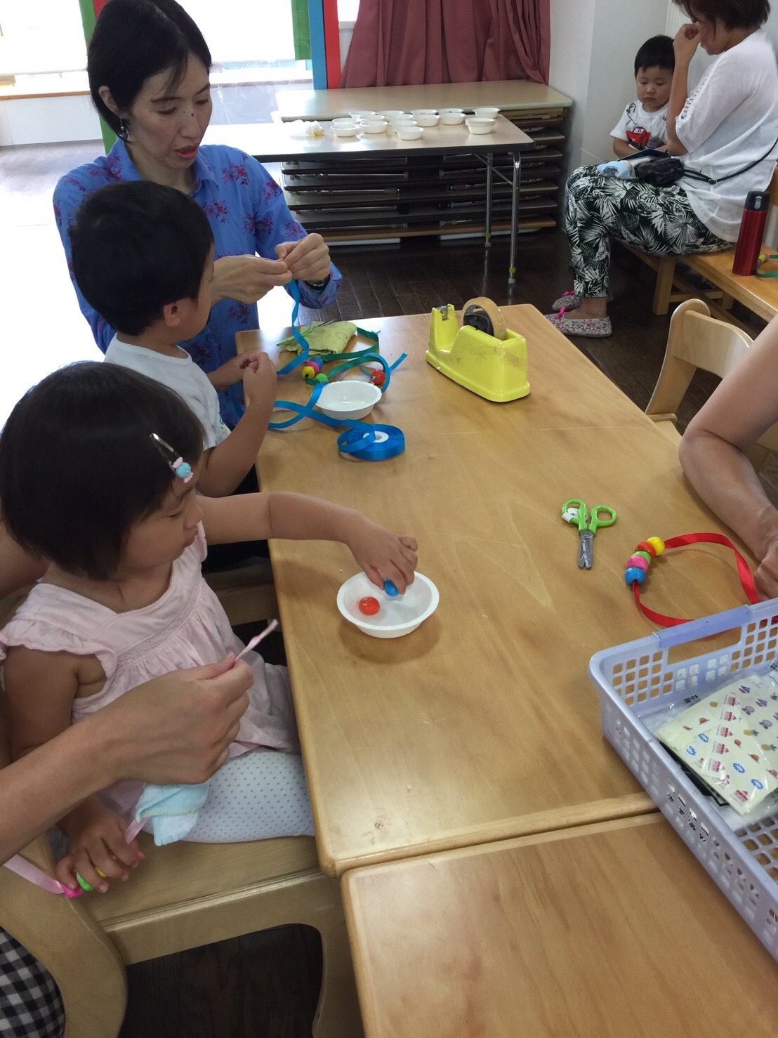 小さな指で一生懸命、リボンに紙粘土を通して。。。かわいいネックレスが出来ました。うれしそうに首にかけているお友達がたくさんいました。