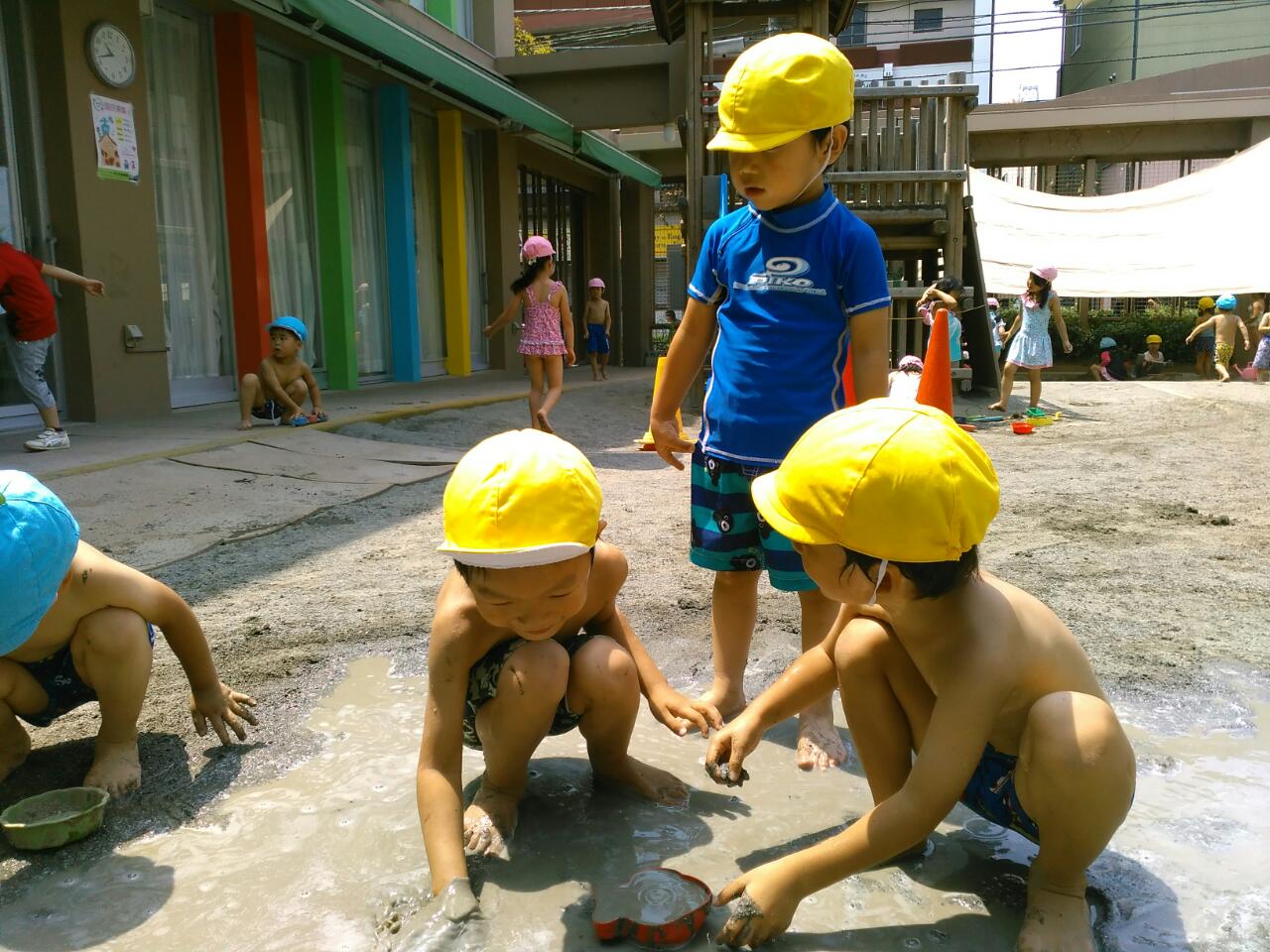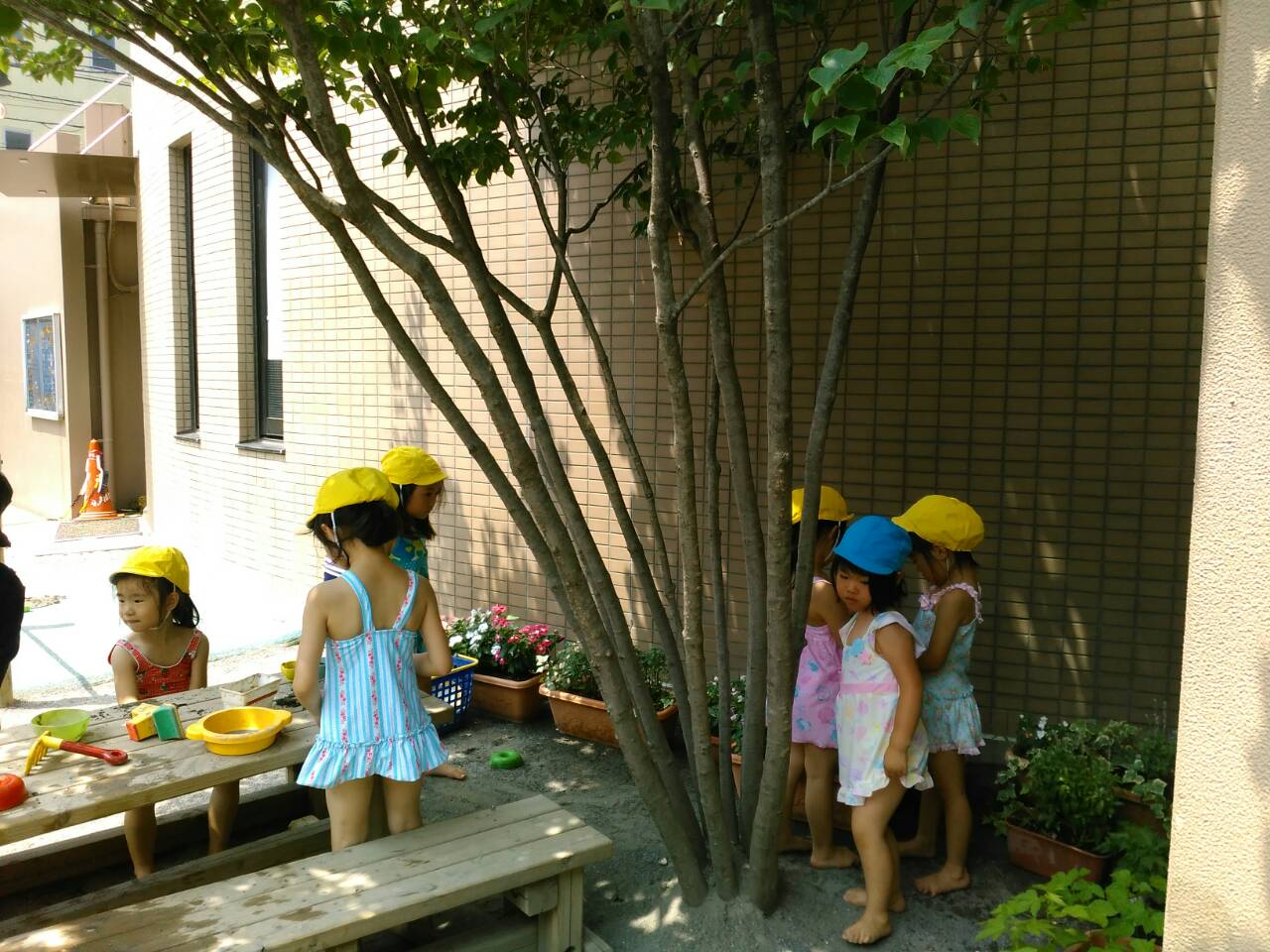 雲が太陽を隠していた朝。夏期保育1日目は、水着に着替えての水遊びを楽しみました。ホースから放たれる水のアーチに、自分から飛び込んでいく『ゆり組』のお友だち…。とっても逞ましくなりましたね。