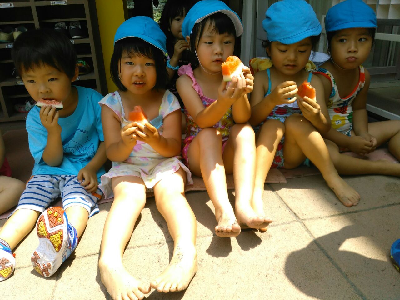 今日のおやつは『スイカ』。お友だちと並んでお庭に向かって食べました。アメリカから来たルーカス先生に『スイカはえいごでなんていうの?』年長組のお友だちは、遊びの中からも学ぶことがたくさんあるようです。