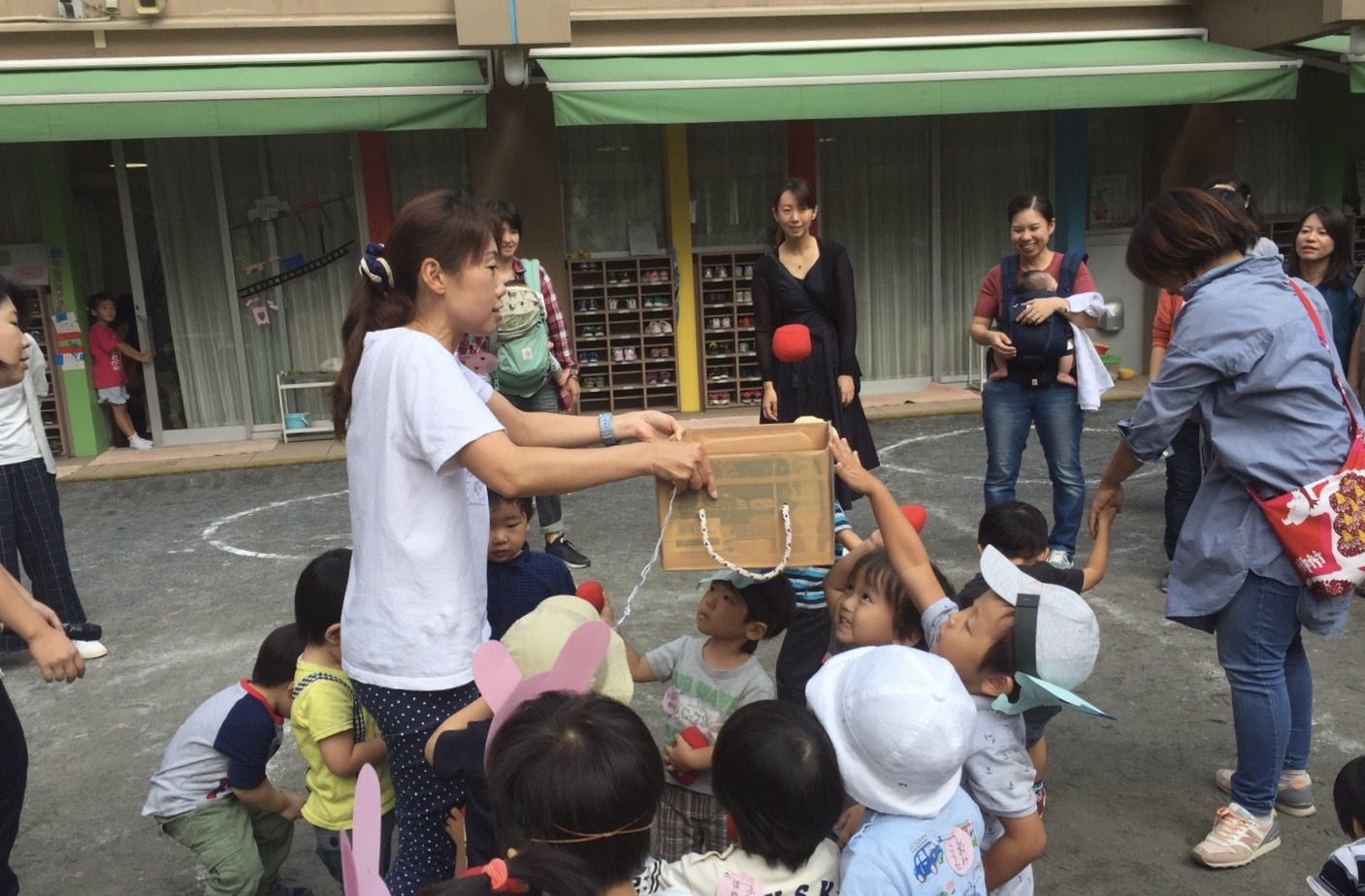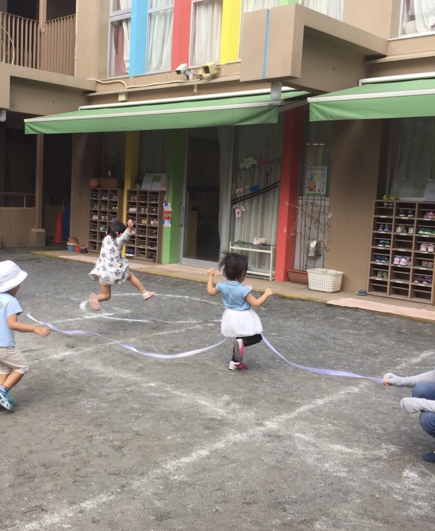 今日は園庭で運動会ごっこをしました。玉入れでは、みんな一生懸命投げていて、楽しそうでした。かけっこも頑張りました。