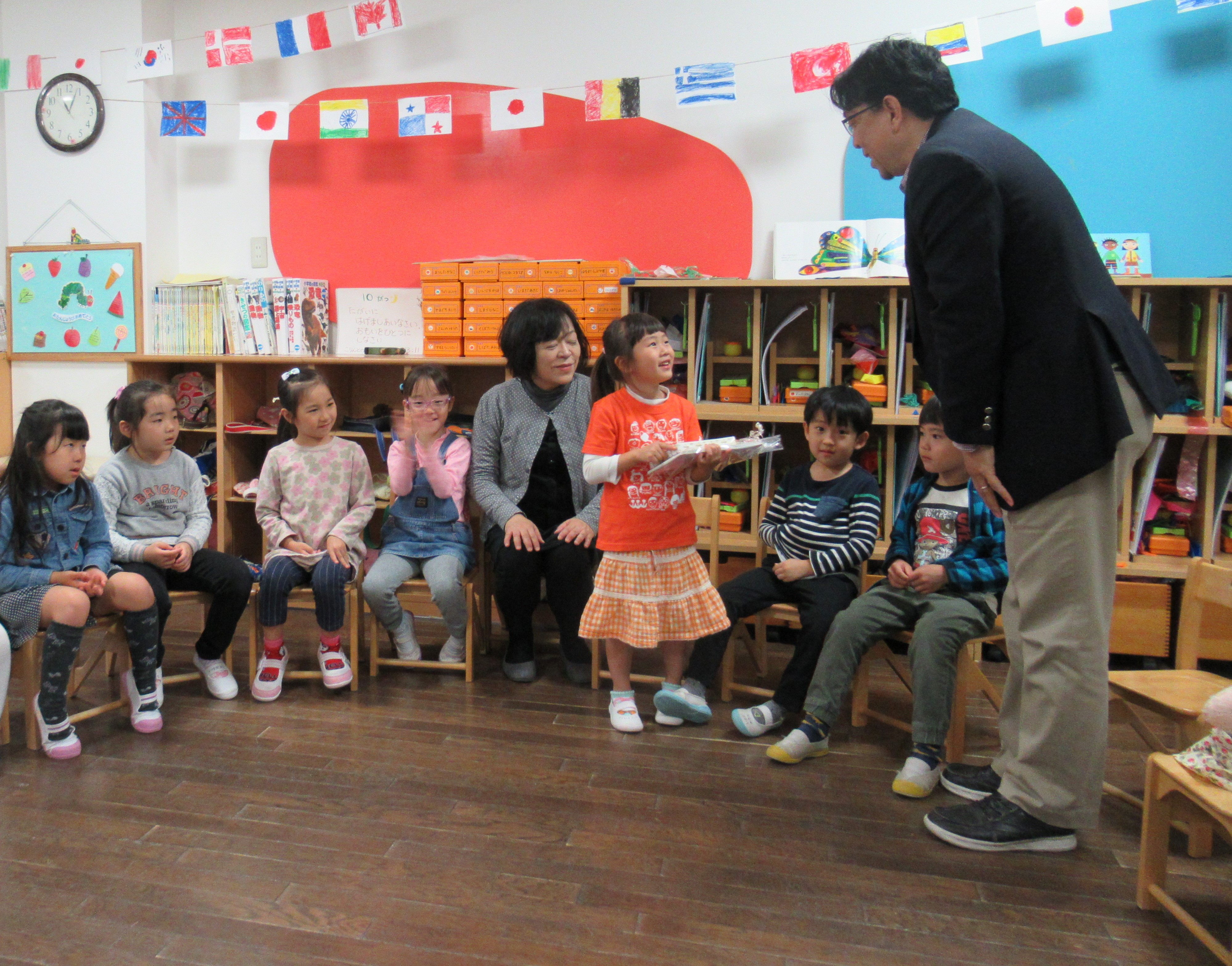 お帰りの会では、お引っ越しするお友だちを囲んで、園長先生と一緒にお祈りしました。