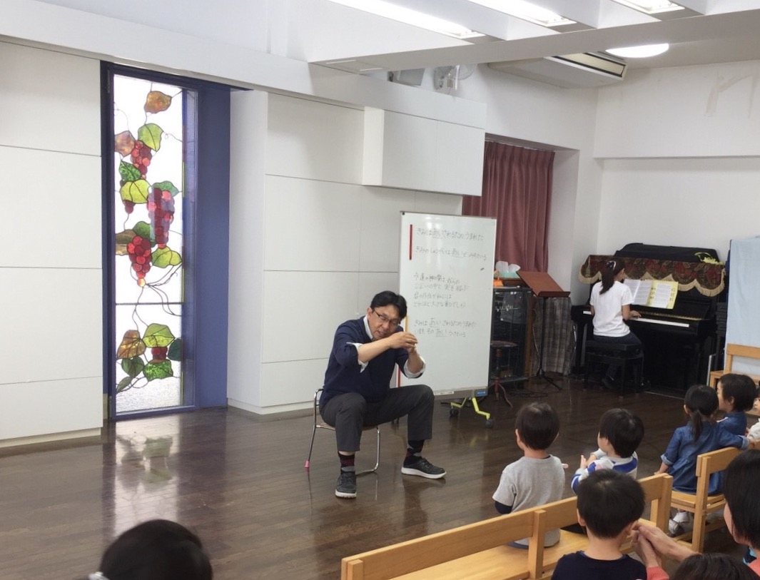 園長先生からのお話。。『きみは愛されるため生まれた』をみんなで歌いました。一人ひとり、たくさんの愛を受けてすくすく成長していきますように。