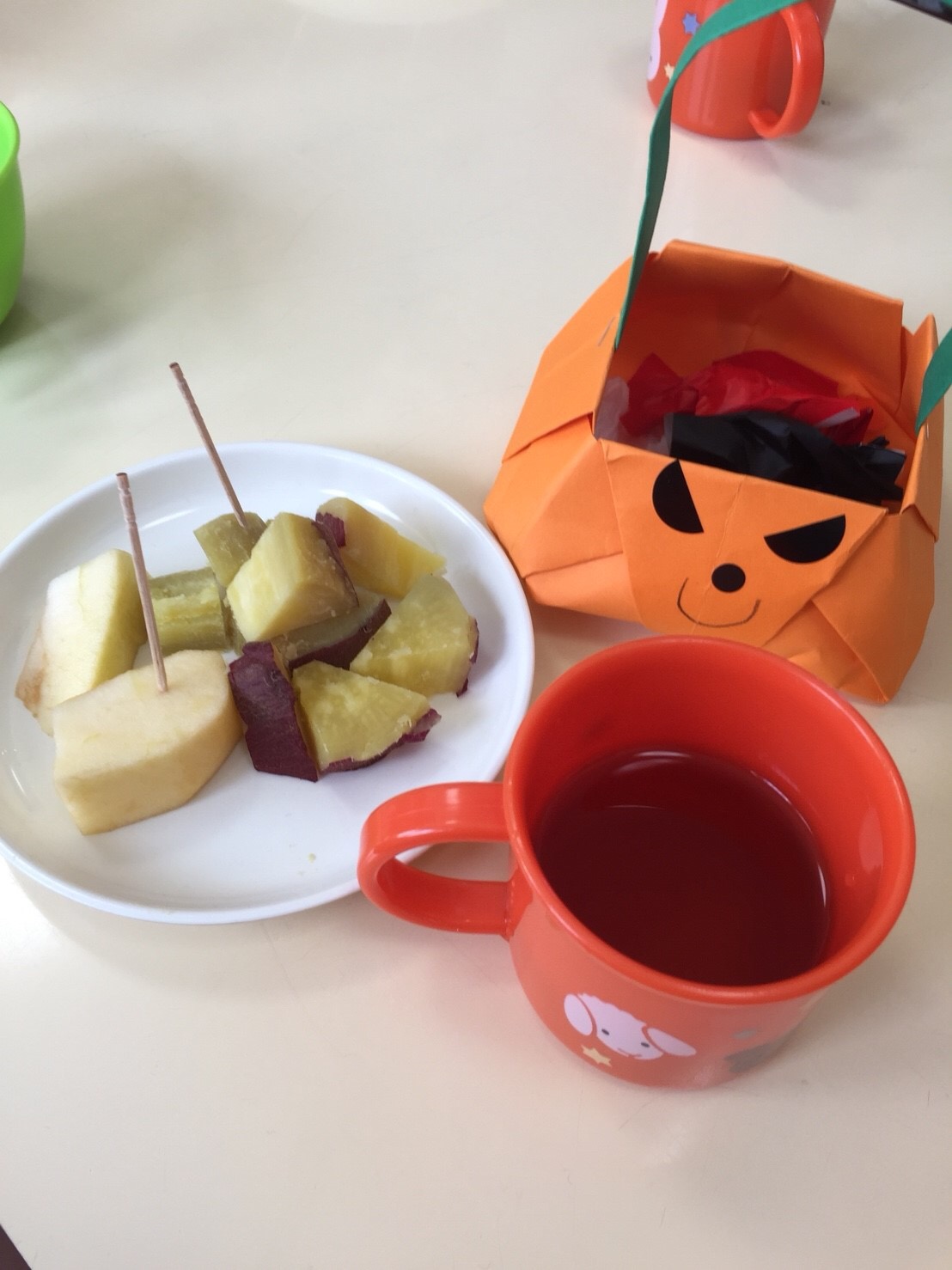年中たんぽぽ組さんからカボチャのバッグをプレゼントしてもらいました。とてもかわいいバッグでしたね。おうちで使って下さいね。