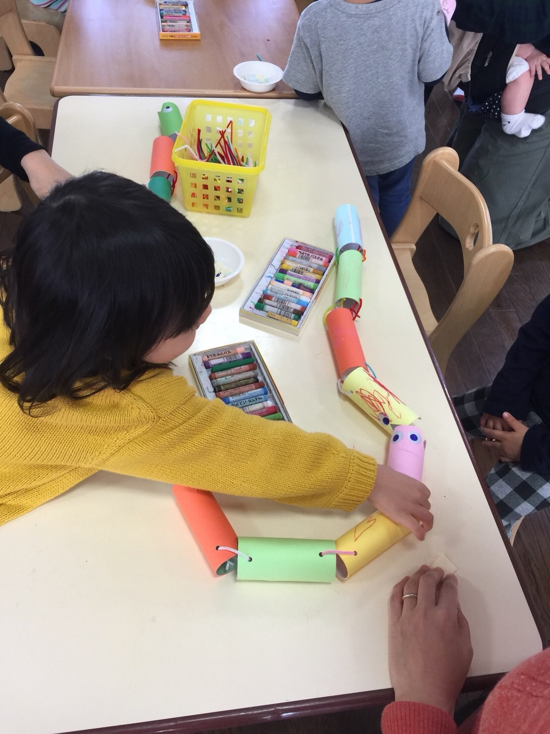 今日はヘビのおもちゃ作りをしました。ヘビさんの体をつなげて、模様を描いたり、シールを貼ったり。いろいろな、かわいいヘビさんが出来上がりました!