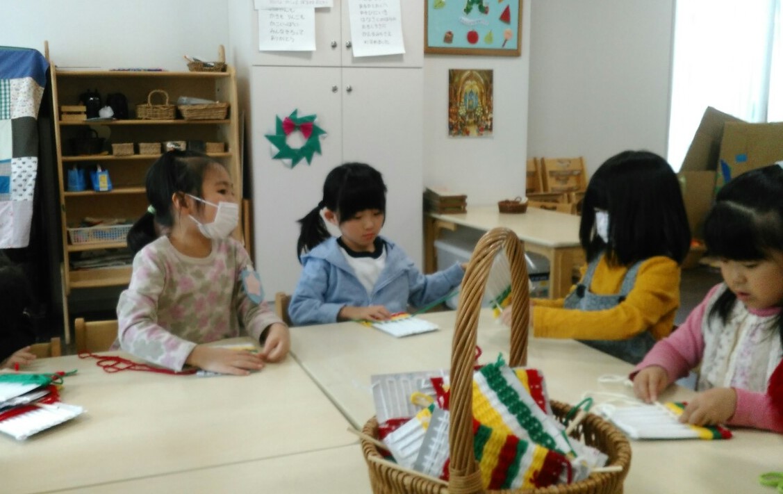 クリスマスカラーのポシェットを編んでいます。一段ずつ根気よくお友だちと一緒に楽しそうです。