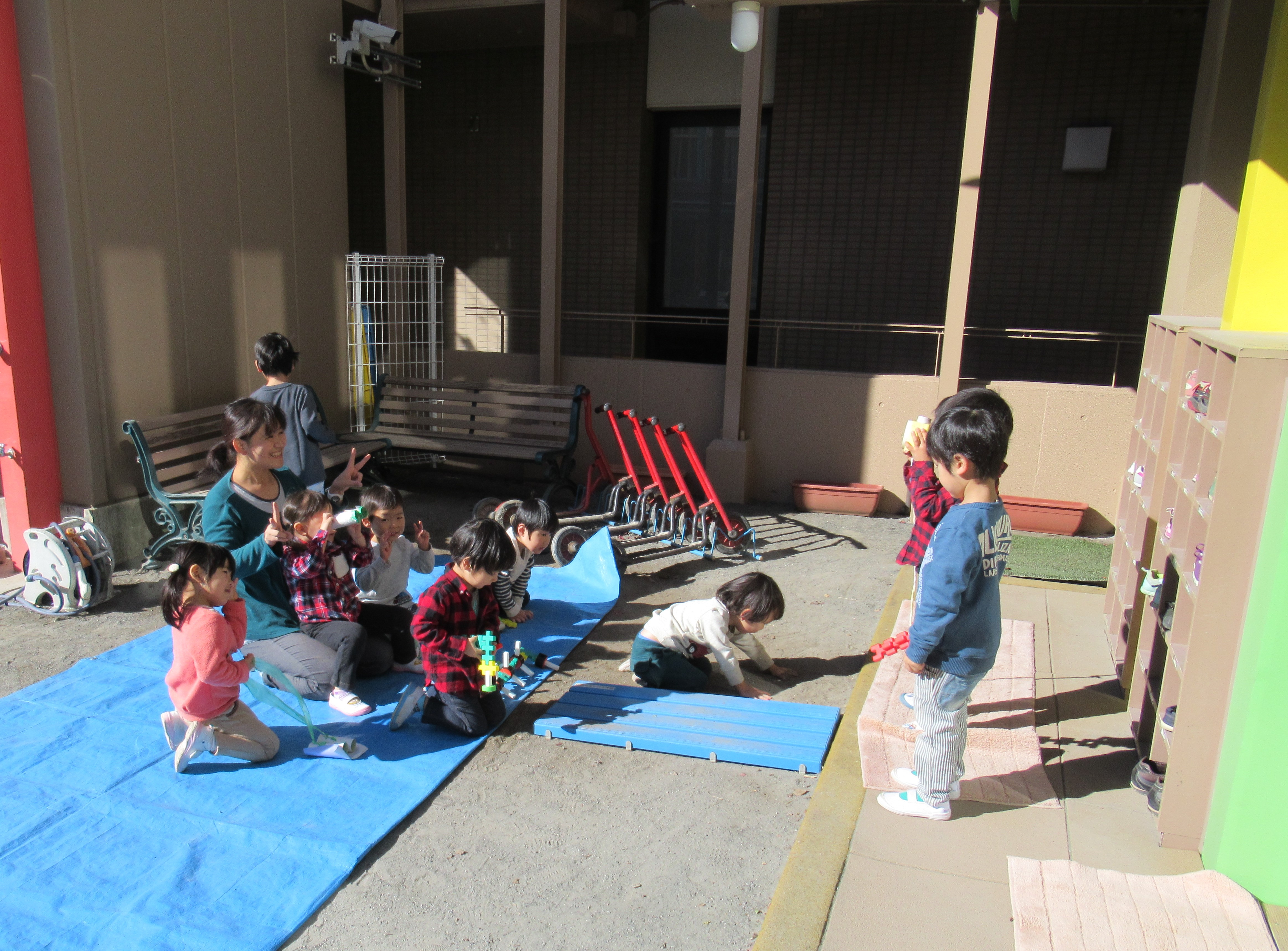 さくら組の前にブルーシートを敷いて、ゆりぐみ島を作って遊ぶのが今のお気に入り。空き箱で作ったカメラを持って、カメラマンの真似をして、「こっち向いて〜 はいチーズ!」と言っていました。とてもいいお顔です♪
