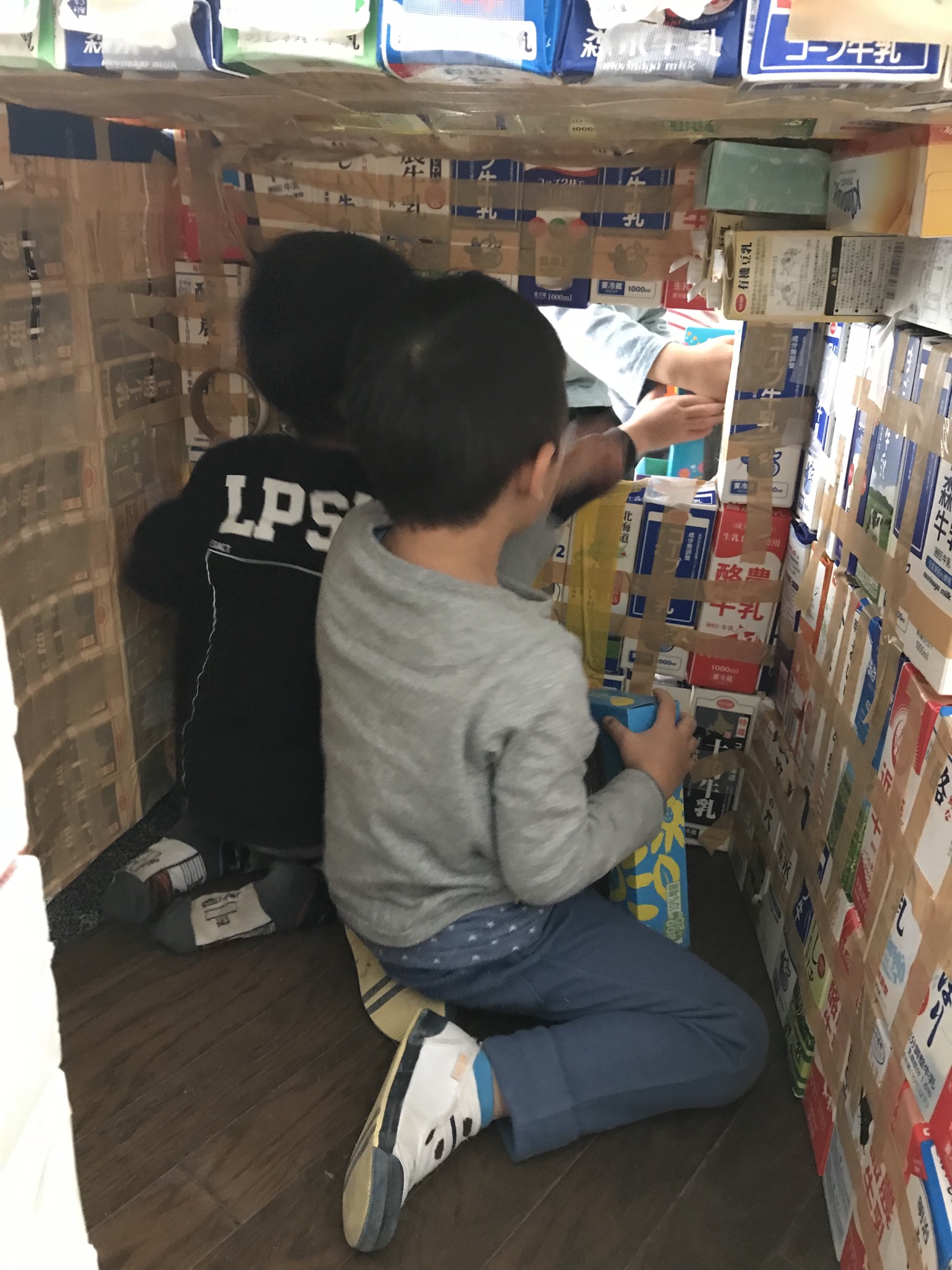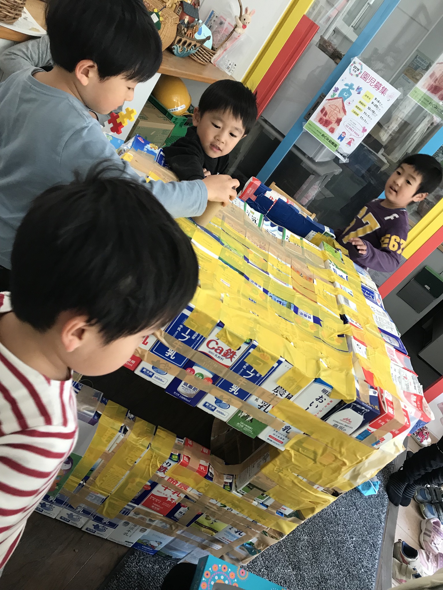 毎日・毎日、牛乳パックを園中からかき集め…朝も昼もお支度やお弁当が終わるとここに来て、コツコツ『家つくり』を楽しんでいました…。