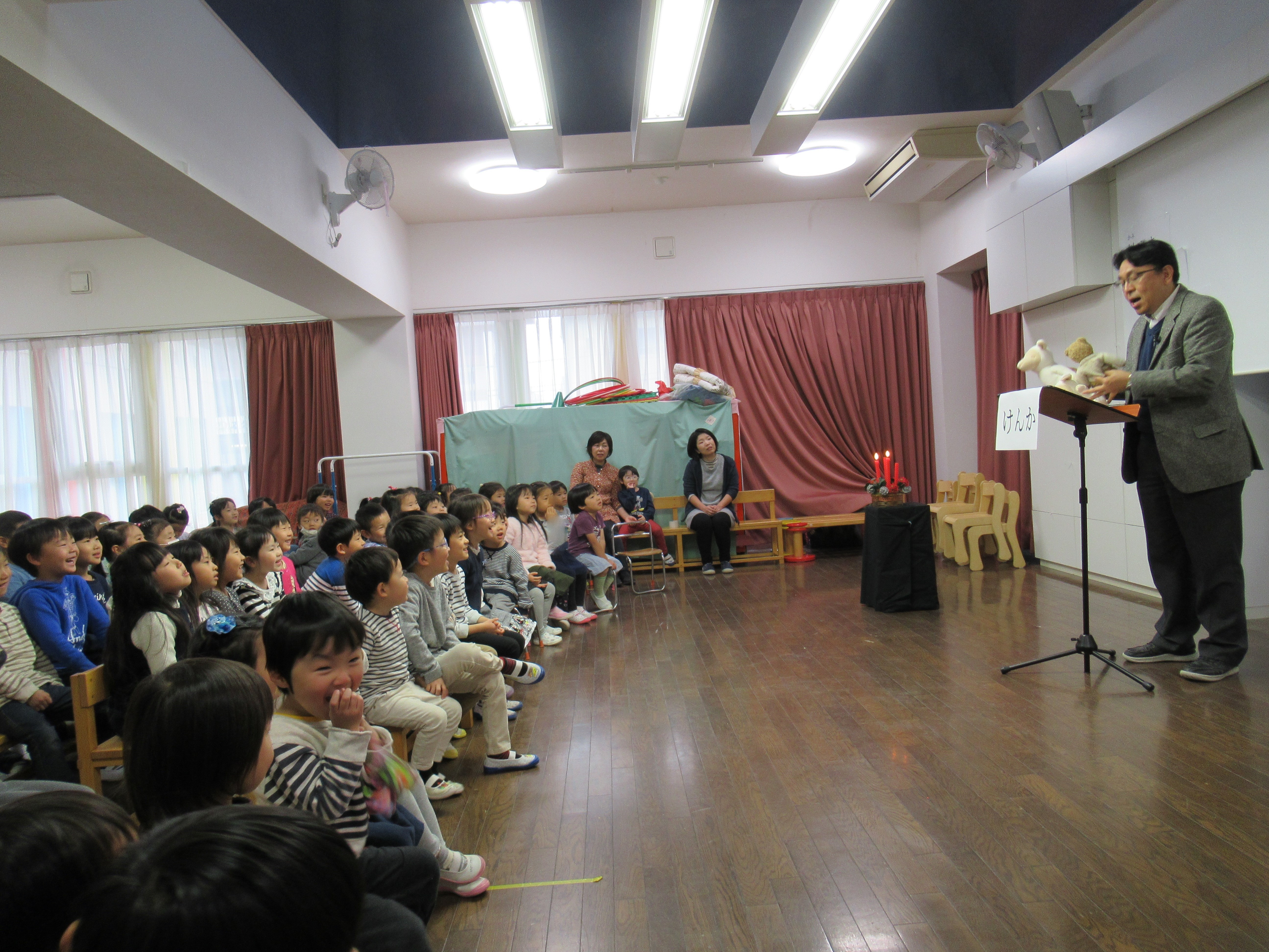 今日は、11月生まれのお誕生日会。皆で、7人のお友だちのお祝いをしました。お誕生日会の最後には、年長組のおうちの方による『パネルシアター』クリスマスのお話を静かに観る事ができました。