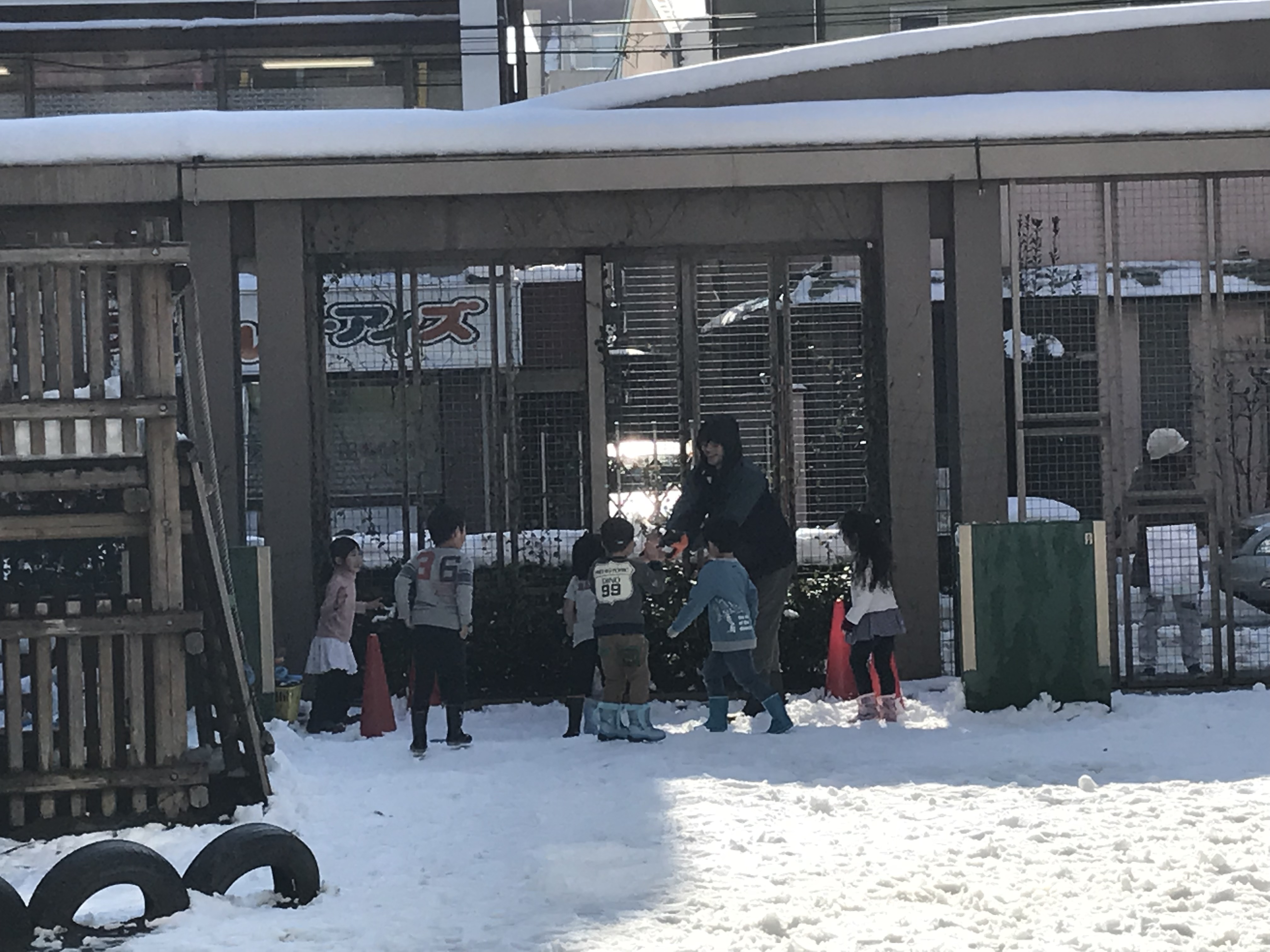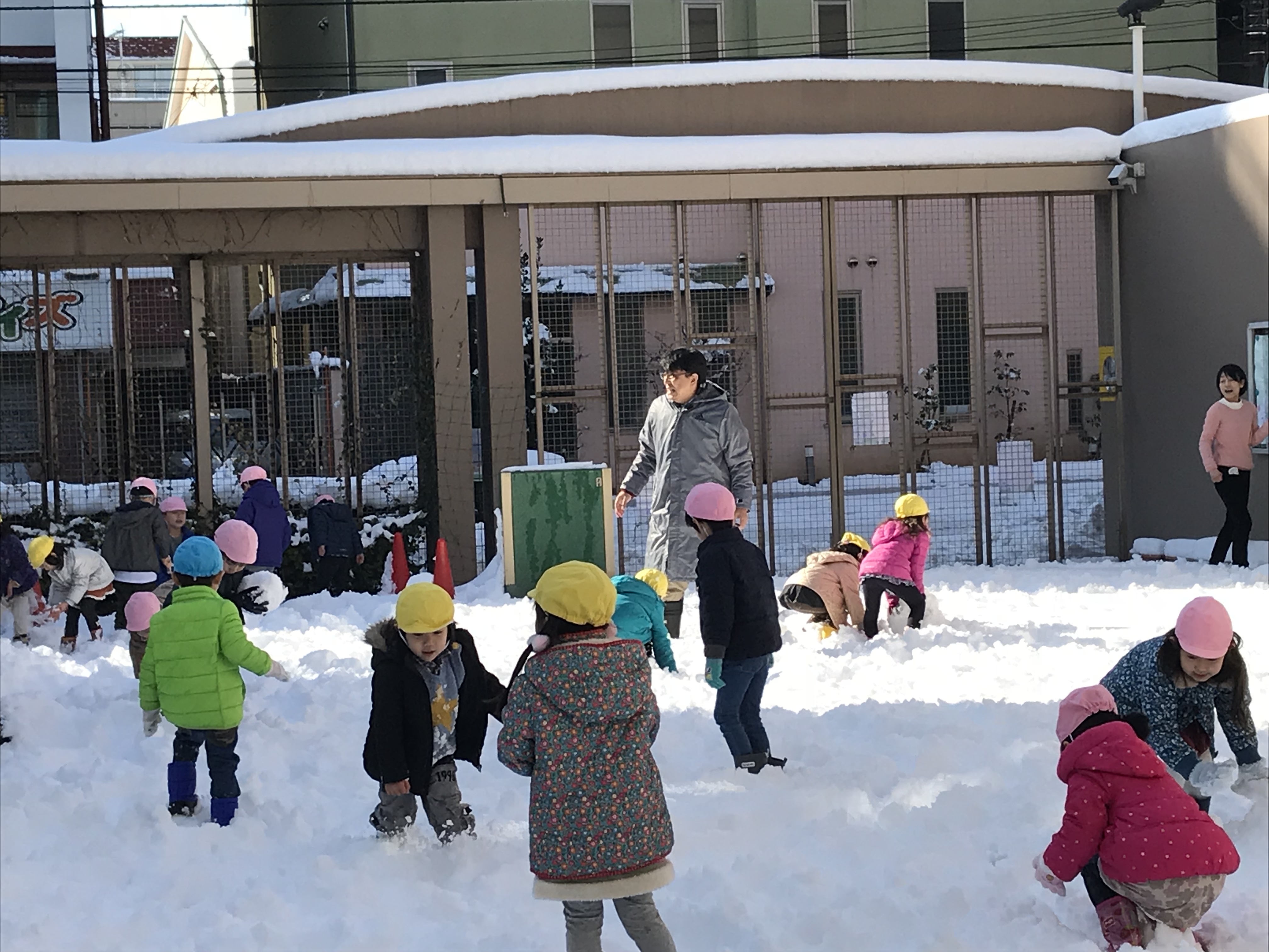 昨日からの雪が降り積もり……幼稚園の園庭は一面真っ白になりました!