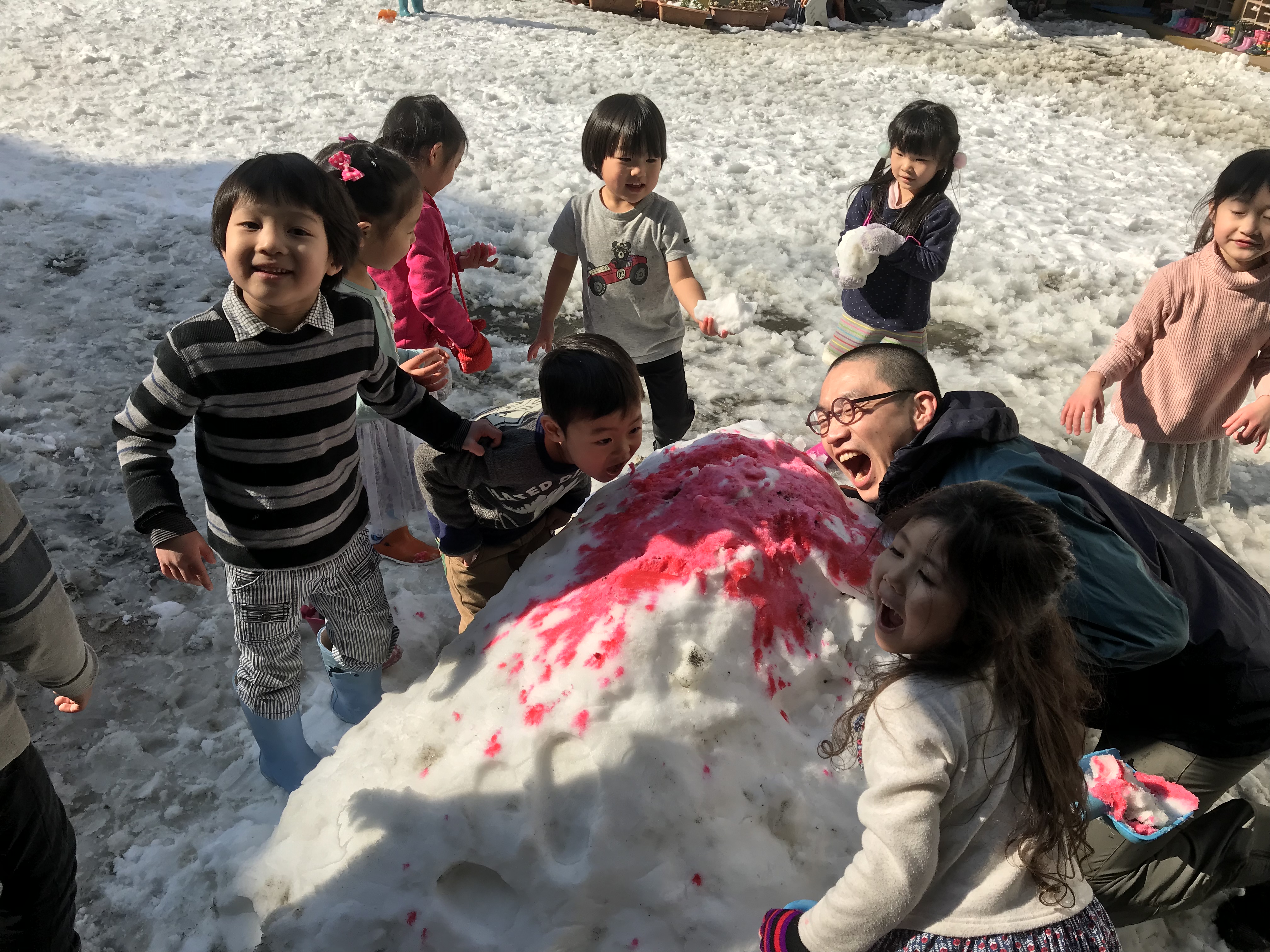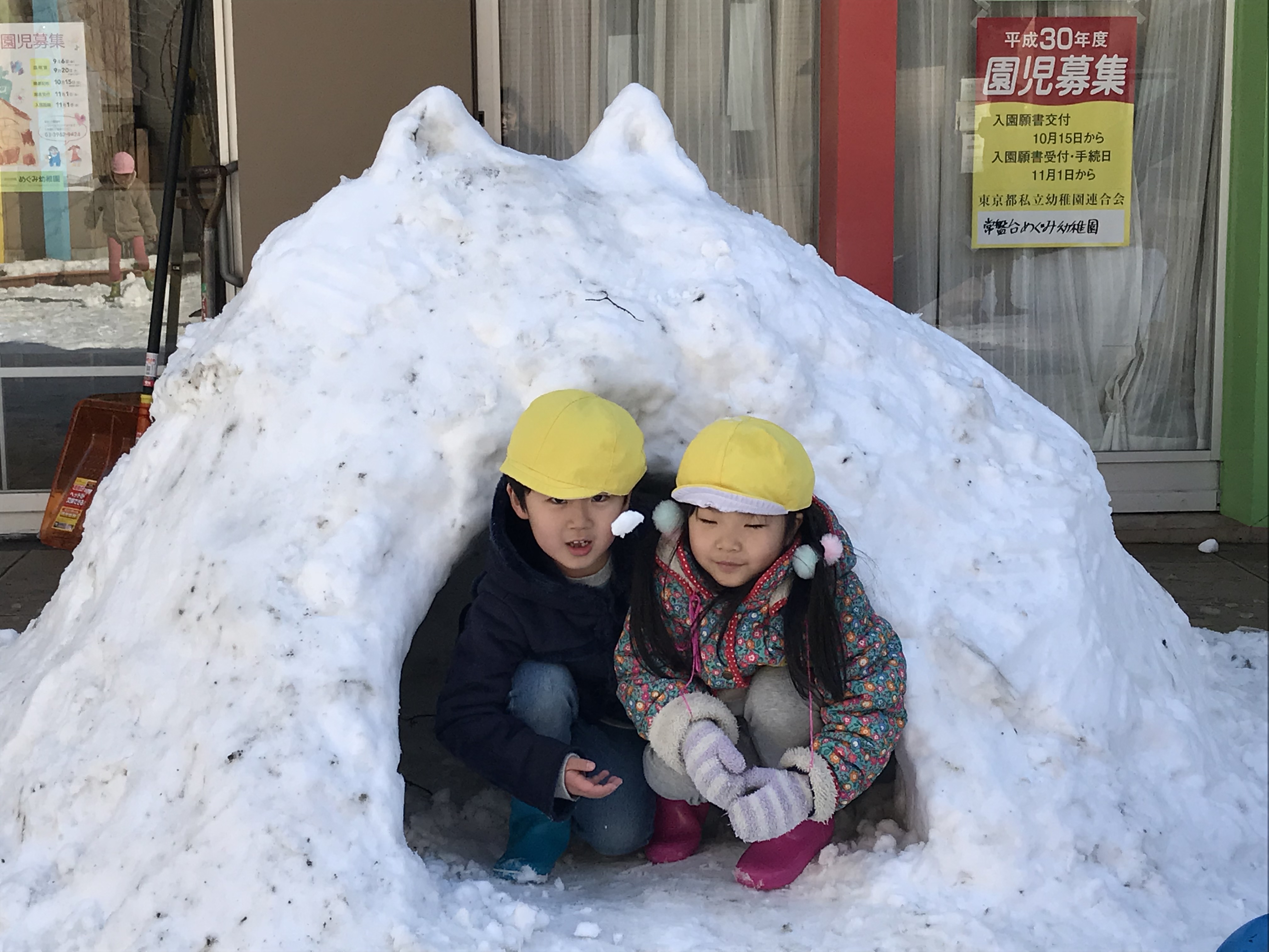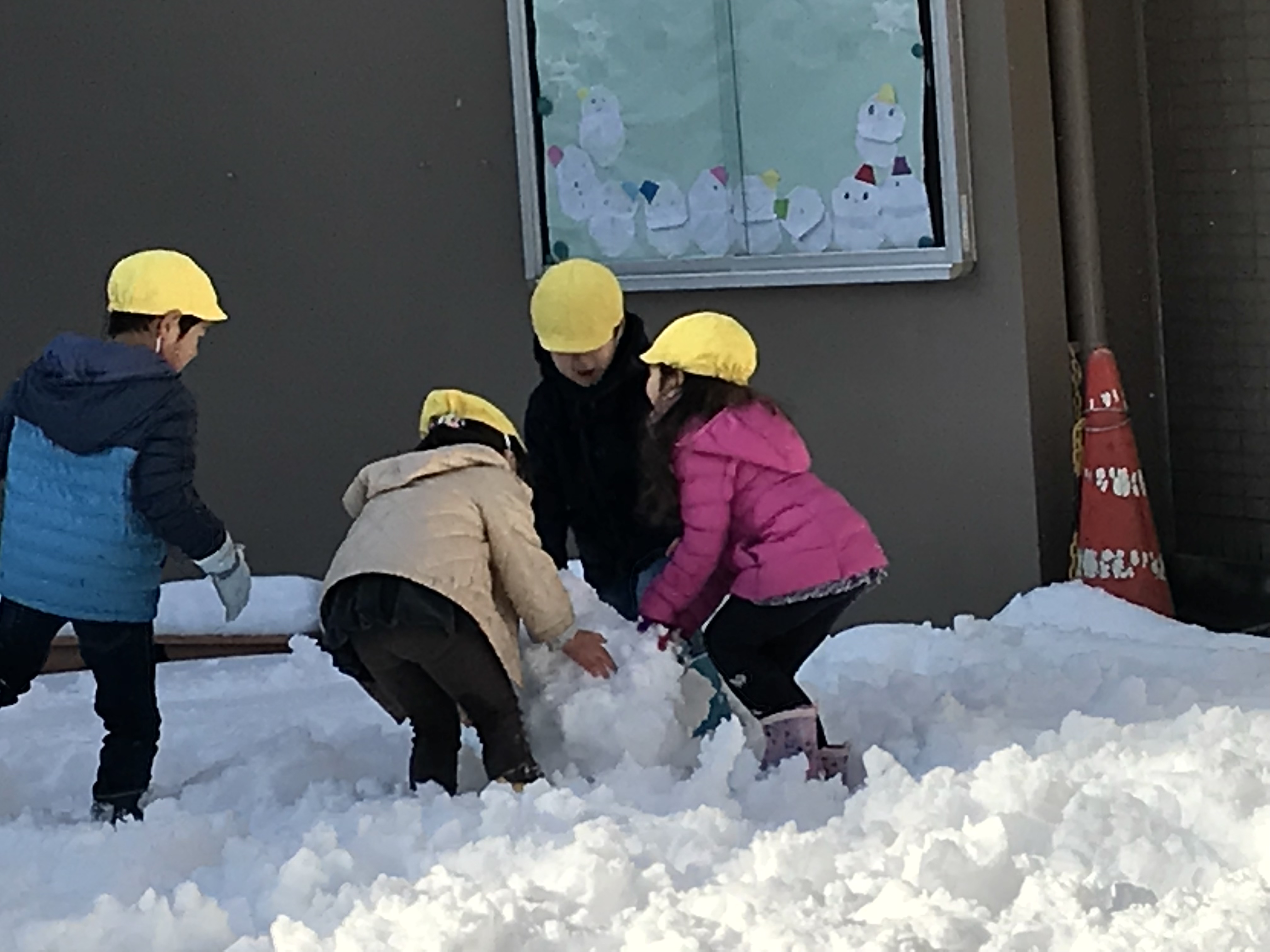 朝から足下の悪い中、幼稚園まで頑張って歩いてきた子ども達は寒くて大変かと思いますが、いつもと違う幼稚園を見て、とても嬉しそうな表情が見られました。短い時間ではありますが、雪遊びをしました。雪だるまや雪合戦、かまくらを作ったり!とっても楽しかったですね!