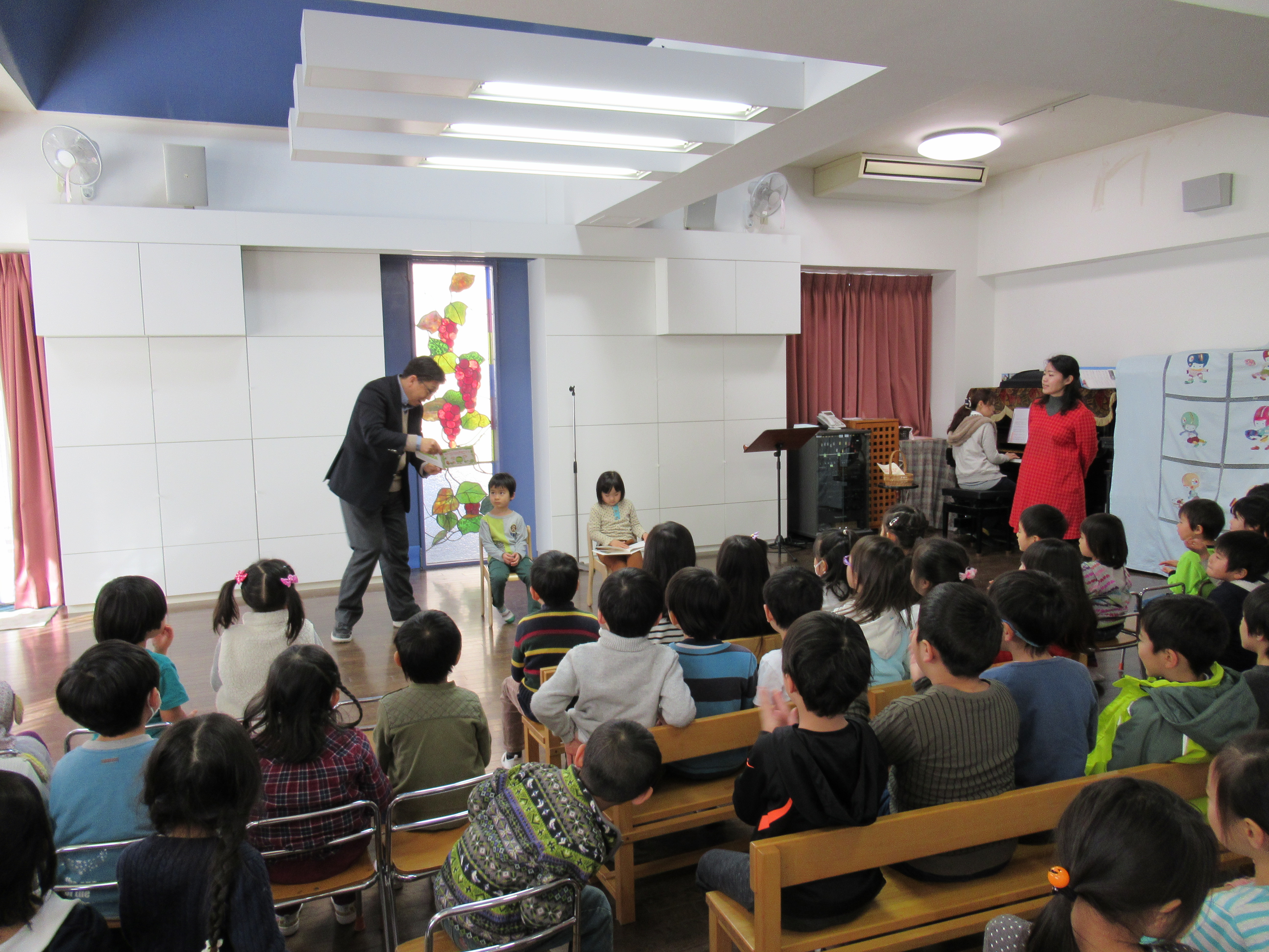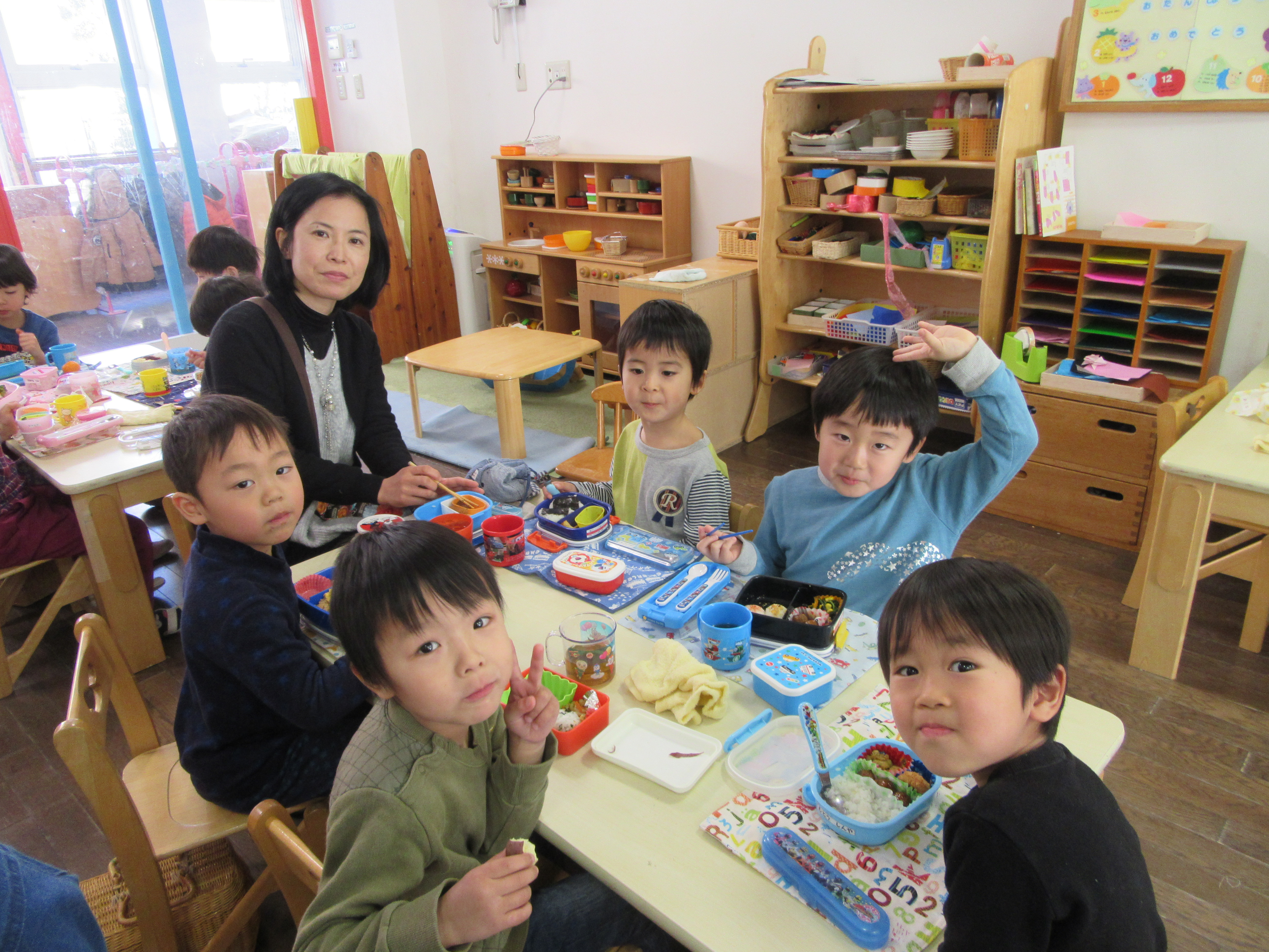 まだ雪が残る中、1月に生まれたお友達のお誕生日会が行われました。体調が悪くてお休みのお友達もいましたが、2人のお友達がお母様に来て頂いてお弁当までの時間を一緒に過ごしました。