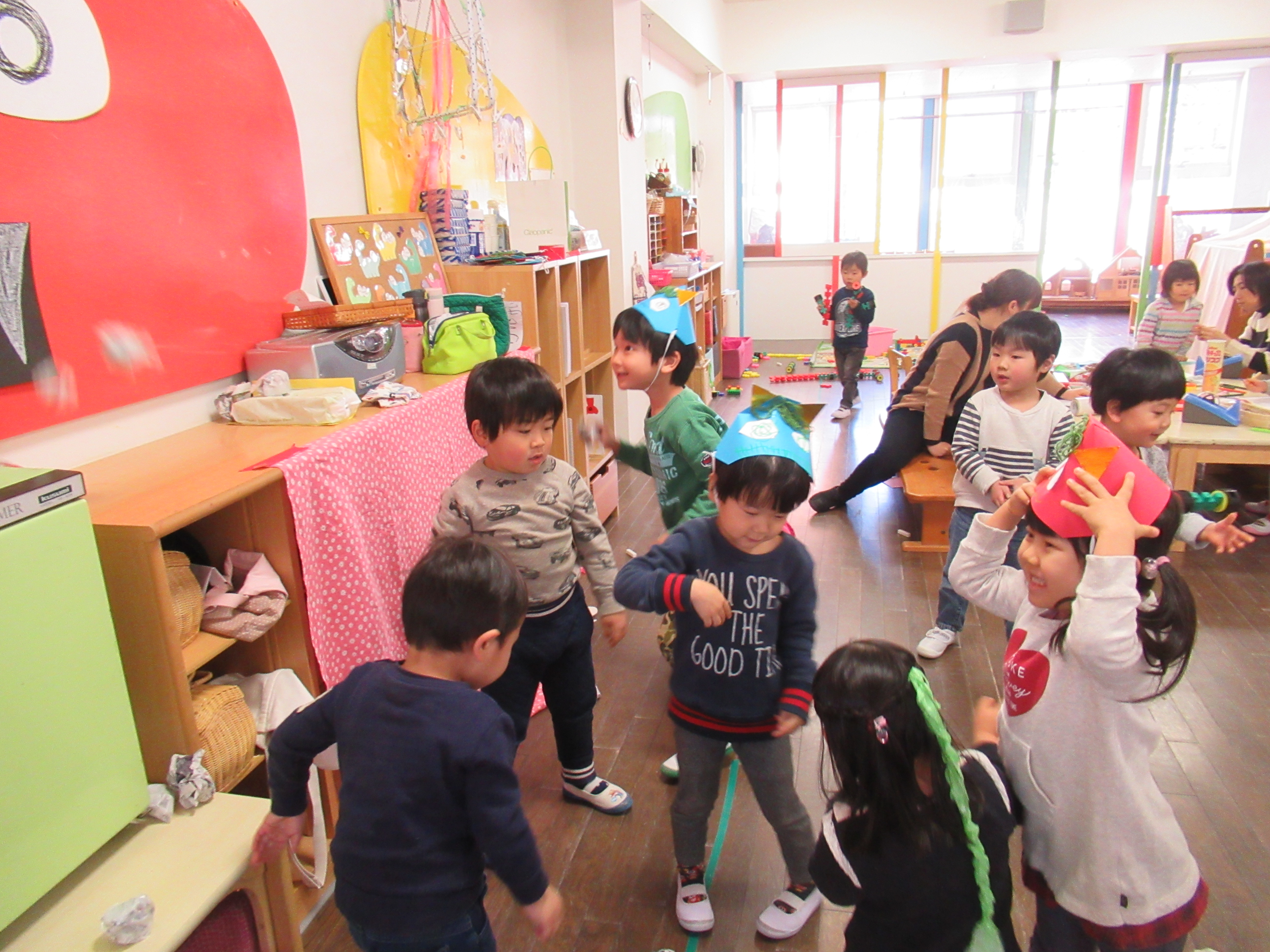 先週金曜日にゆり組では節分遊びをしました。作った鬼のお面を被り、たんぽぽ組のお友達を脅かしに行ったり、壁の鬼に向かって新聞紙ボールを当てて遊んだりしました。金曜日は雪で幼稚園に来られなかったお友達も多かったので、今日も少し節分遊びをして楽しみました。