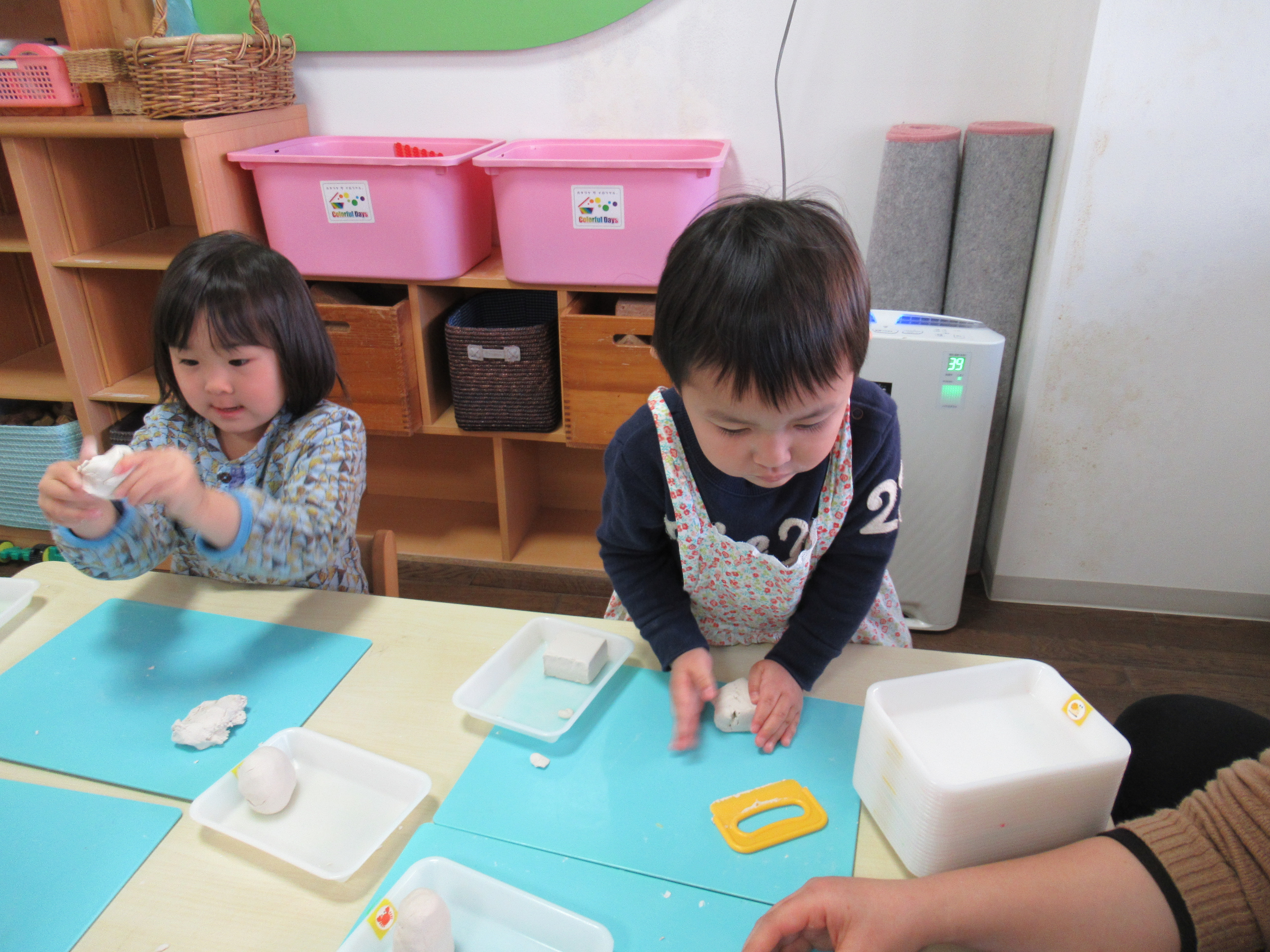 そして、3月のひな祭りの製作をしました。硬い粘土を丸めるのは難しそうでしたが、頑張ってこねていました。1つずつ自分の力で出来るようになってきたゆり組さん。