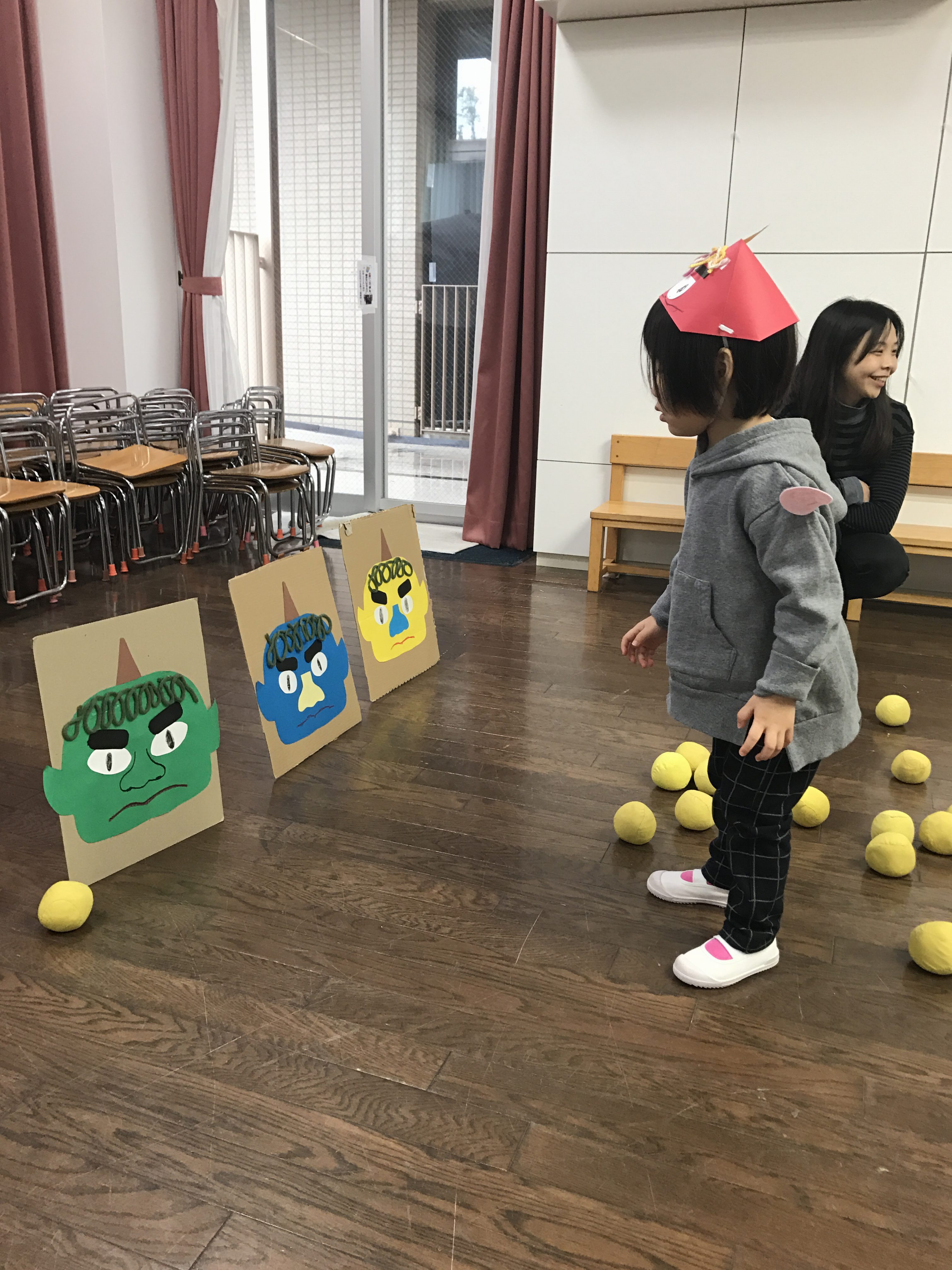 先週、製作した鬼のお面をかぶって豆まきあそび。玉を投げて、鬼退治をして遊びました。とても楽しそうでした。