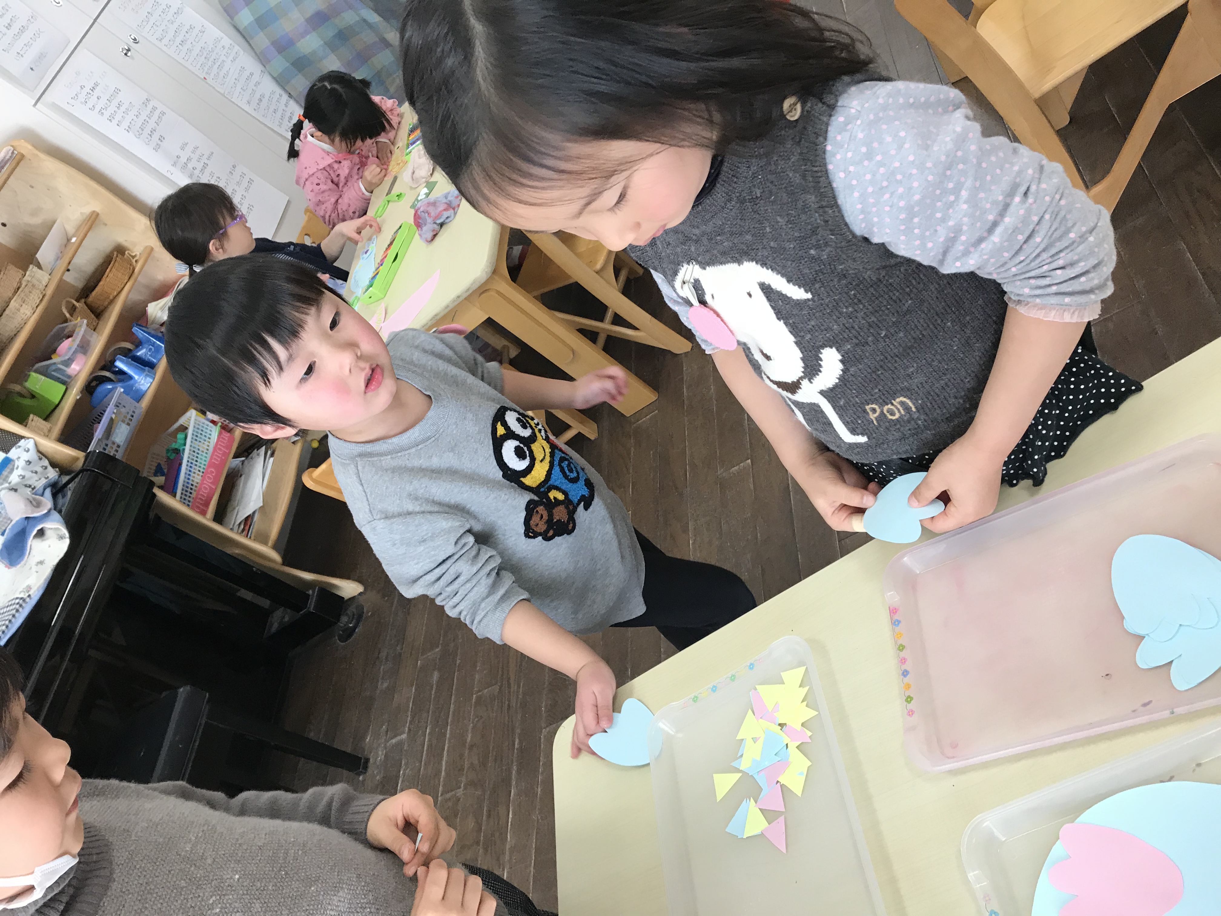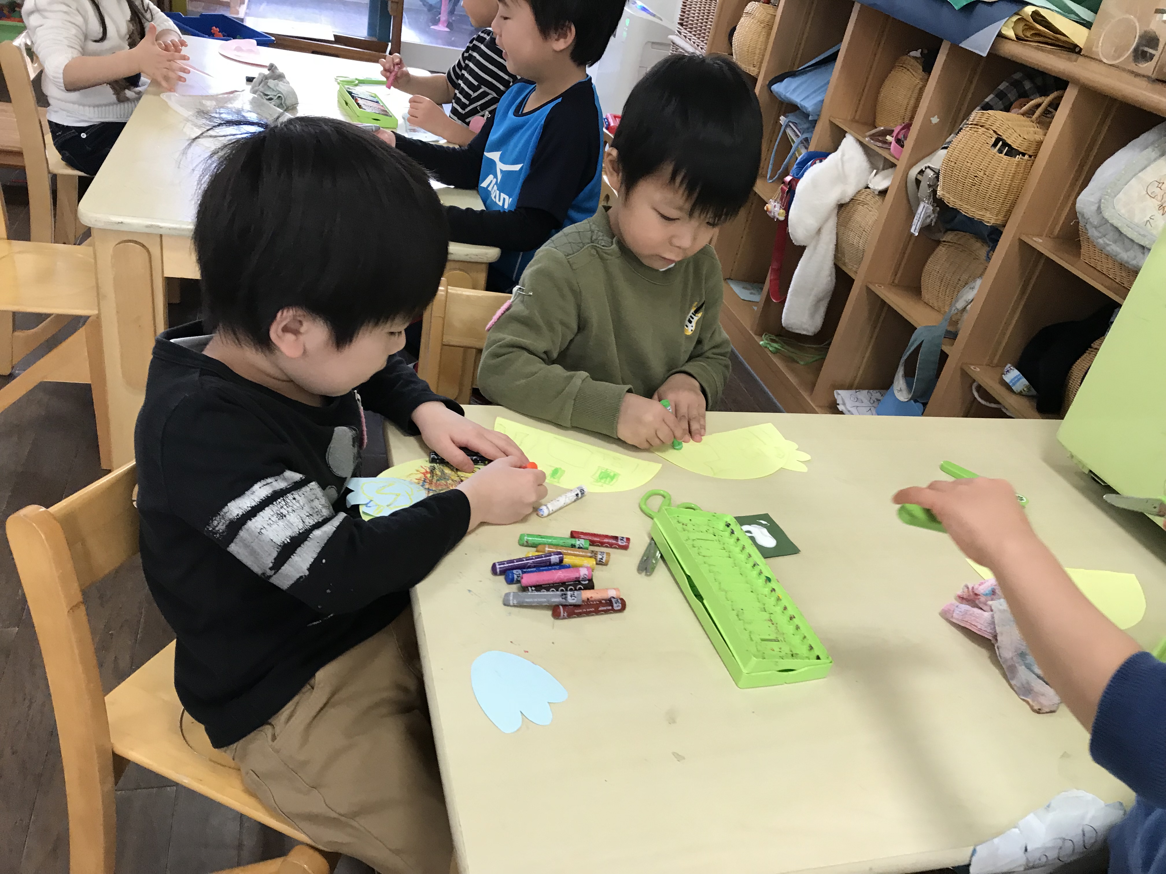 年長さんが、小さなお友だちの作業行程を手伝ってあげたり、クレヨンやハサミも声をかけて貸してあげるステキな姿が見られました。