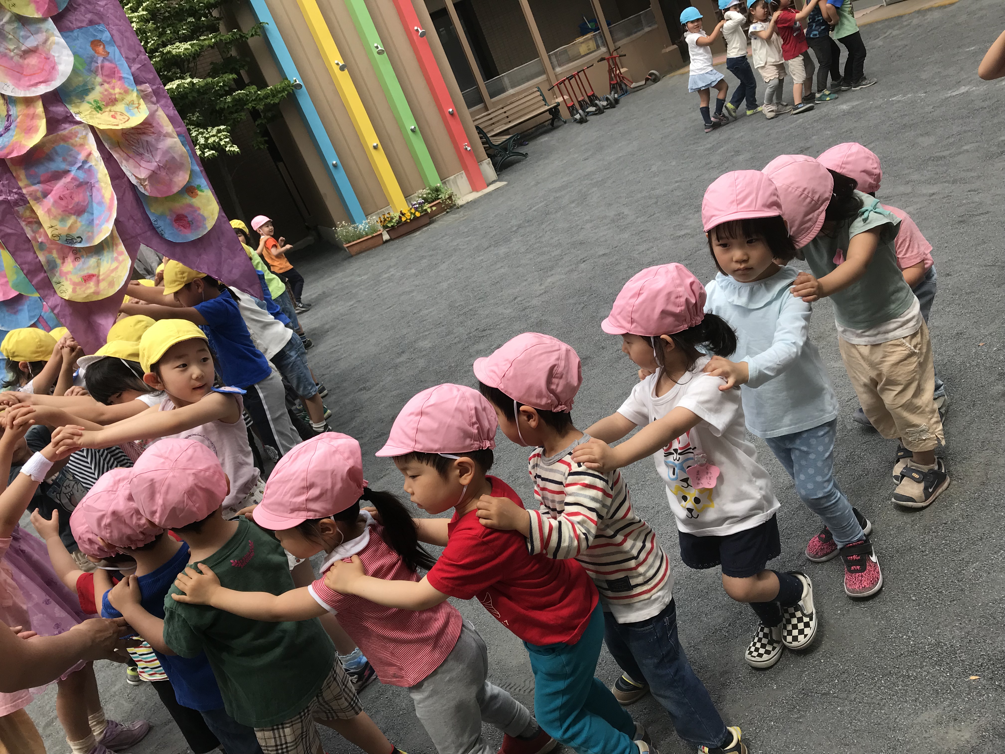 体操の後は…年長組さんがトンネルを作ってくれて、小さなお友だちが電車になって通ります。 大きなクラスの子どもたちが、小さなクラスの子どもたちを楽しませてくれる、代々受け継がれている光景です。