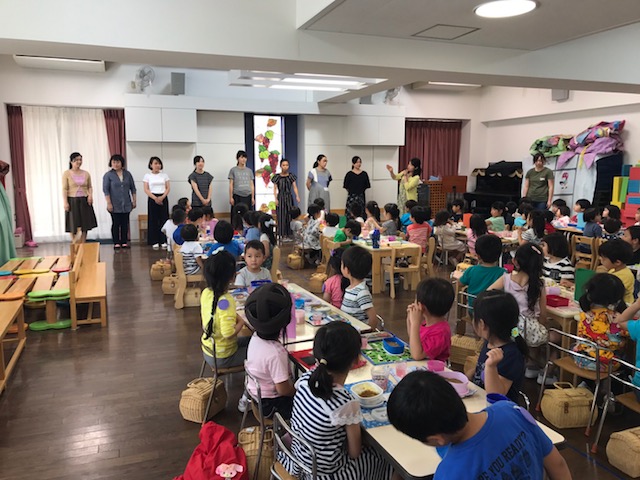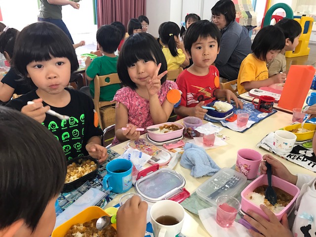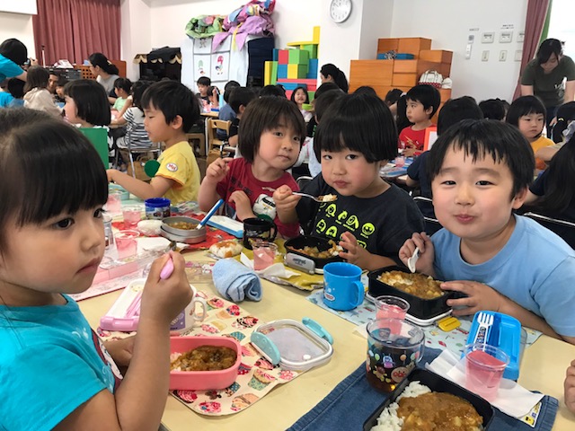 親子会食 今日のひとこま 2018.05.15 今日は親子会食でした! ゆり組さんは初めて幼稚園でカレーを食べましたね。美味しそうにたくさん食べている様子が見られました。お兄さんお姉さんと一緒に食べるカレーは美味しかったですね。