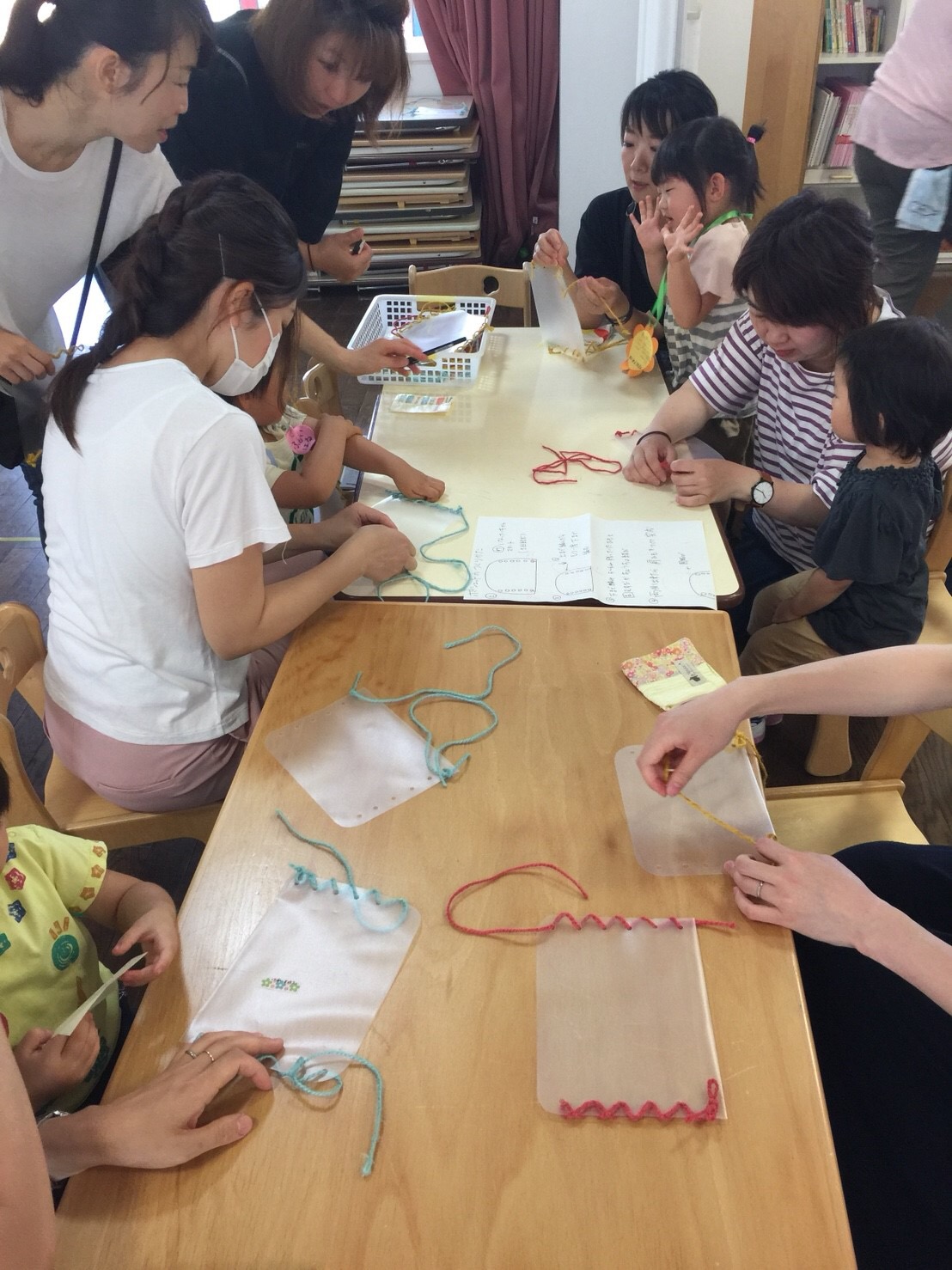 5月31日(木)はお店やさんごっこです。美味しいデザートやさんや、手作りのおもちゃやさんが開店しますよ。今日作ったひも通しのポシェットを持って、ぜひ遊びに来てくださいね!!