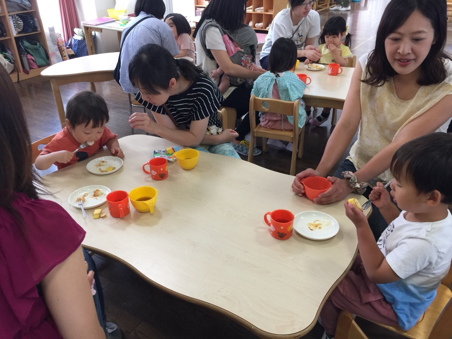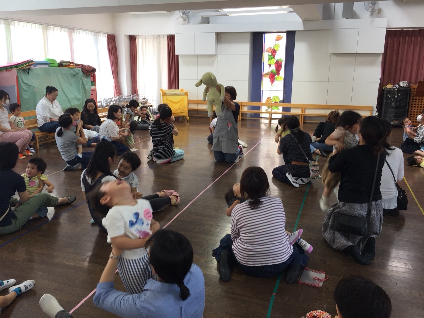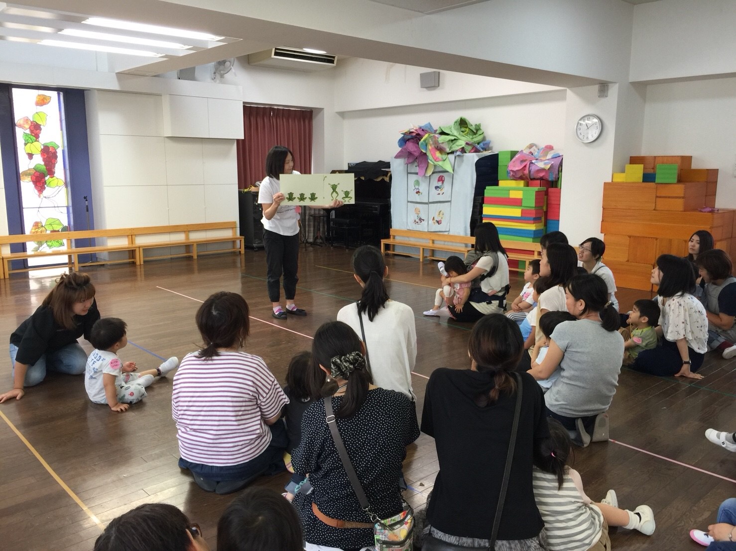 お母さんとの触れ合い遊びでは、もも組さんのお友だちもお母さんもニコニコ笑顔で、あたたかい時間が過ごせましたね、大好きなお母さんのおひざの上で、紙芝居を読んでもらうと、心を落ちつかせ、お話の世界を楽しんでました。