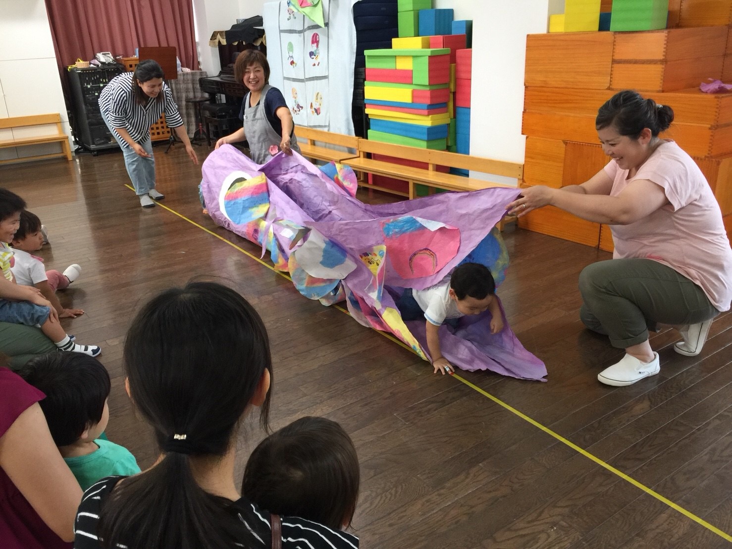 今日のもも組さんは、めぐみようちえんのお兄さんお姉さんが作った大きなこいのぼりに入って、長いトンネルを探検しました!はじめはちょっとドキドキしたけれど、周りのお友だちがこいのぼりに入っていく姿を見て、「やってみよう!」と挑戦できたお友だちもいましたね、素敵でしたよ。