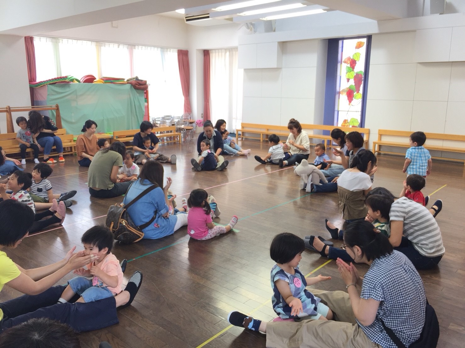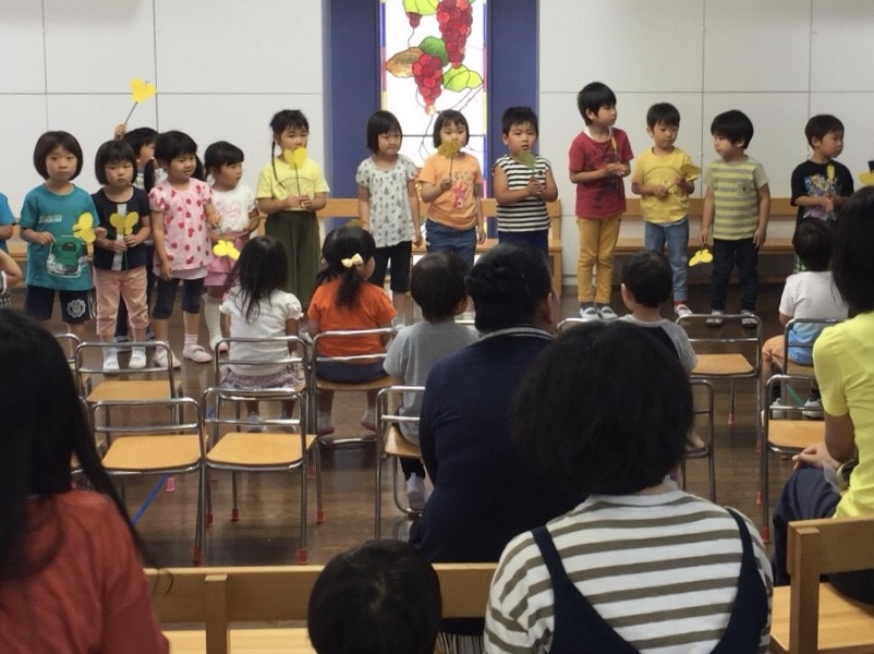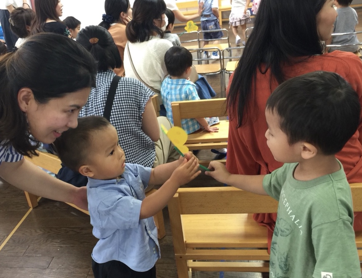 お部屋に戻って、朝のお集まりで椅子に座ってお名前を呼ぶと、「はい」とかわいいお返事が聞こえて、嬉しかったです。お礼拝をして、お母さんお友だちと一緒になべなべそこぬけをして、周りのお友だちと力を合わせてくぐれたかな?