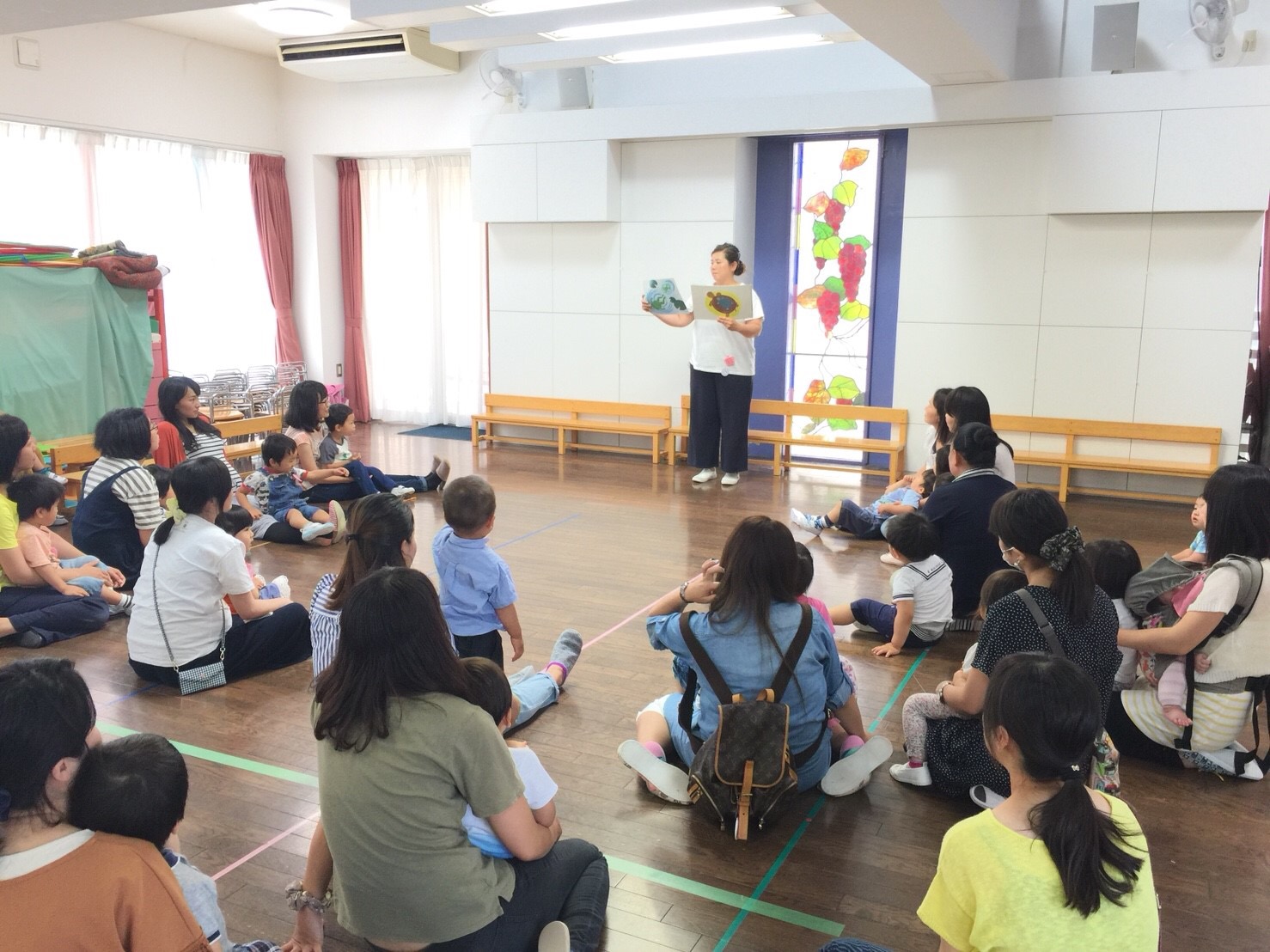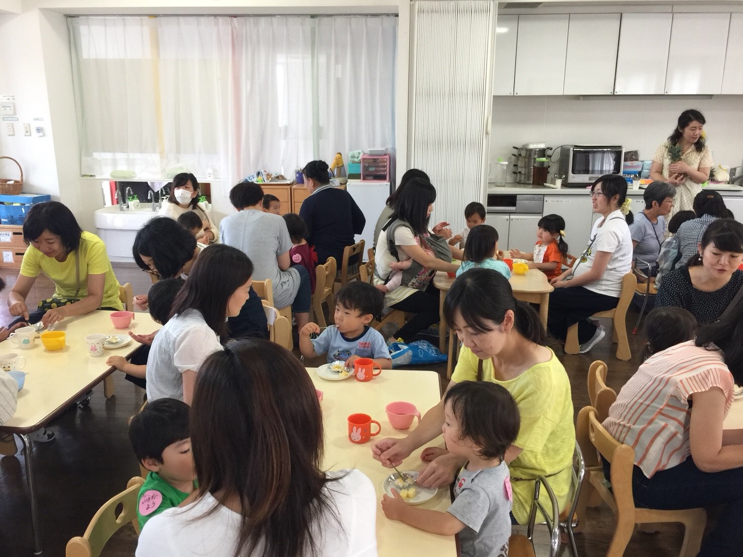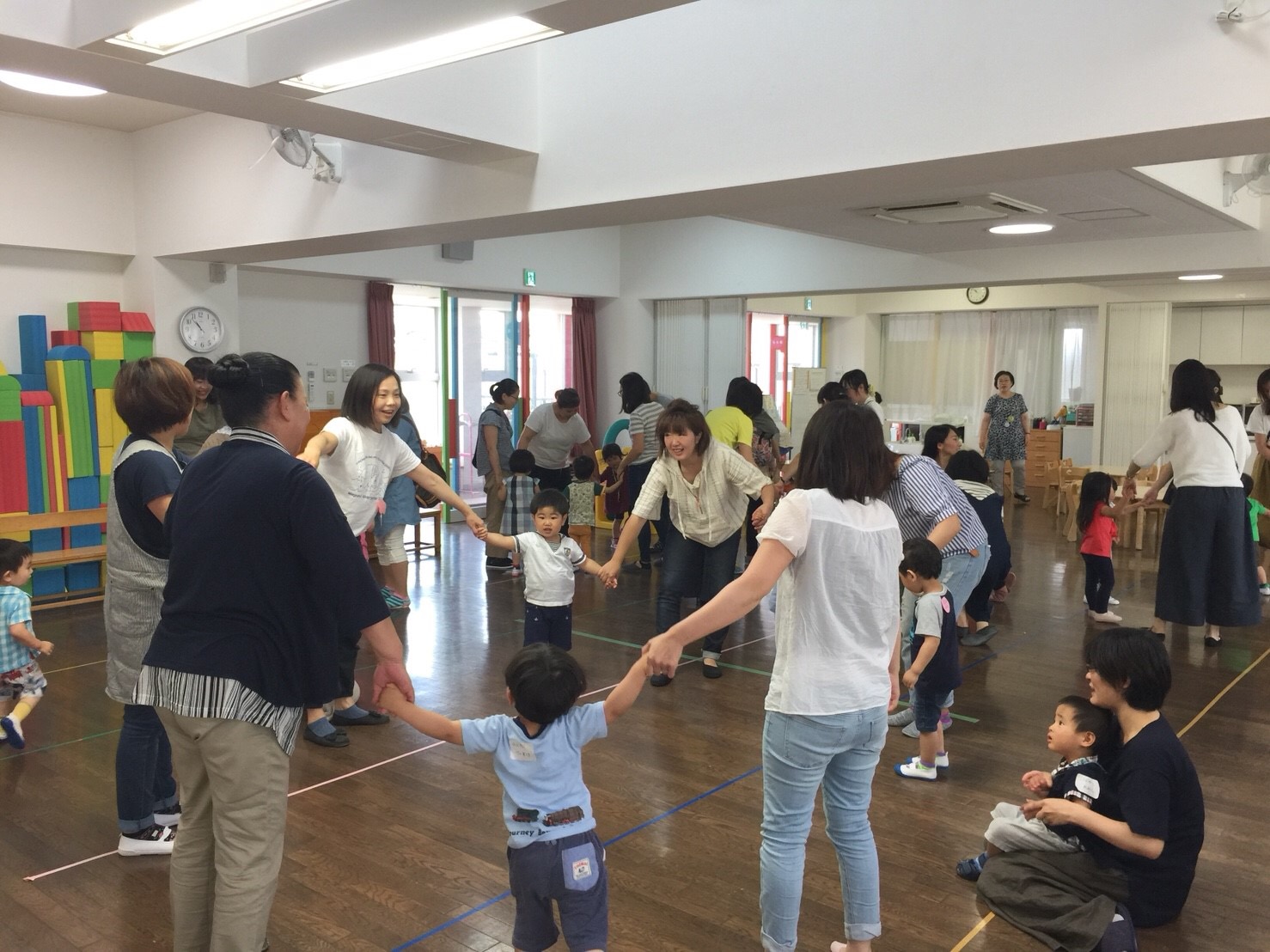 お部屋に戻って、朝のお集まりで椅子に座ってお名前を呼ぶと、「はい」とかわいいお返事が聞こえて、嬉しかったです。お礼拝をして、お母さんお友だちと一緒になべなべそこぬけをして、周りのお友だちと力を合わせてくぐれたかな?
