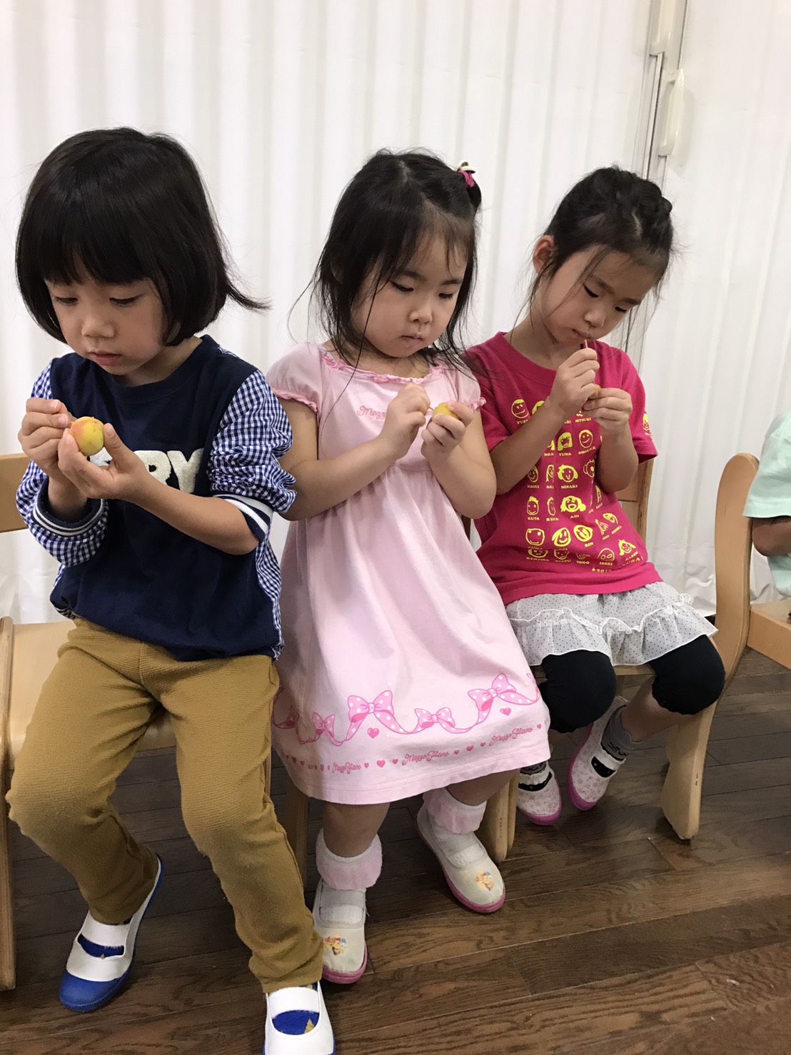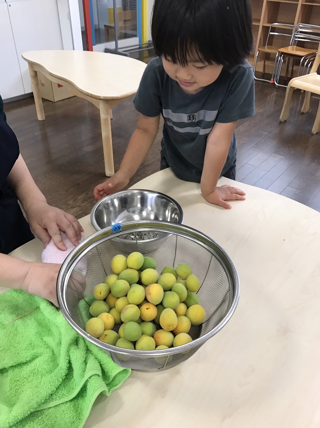恵みの雨が降る中、年長さくら組では、梅ジュース作りをしました。