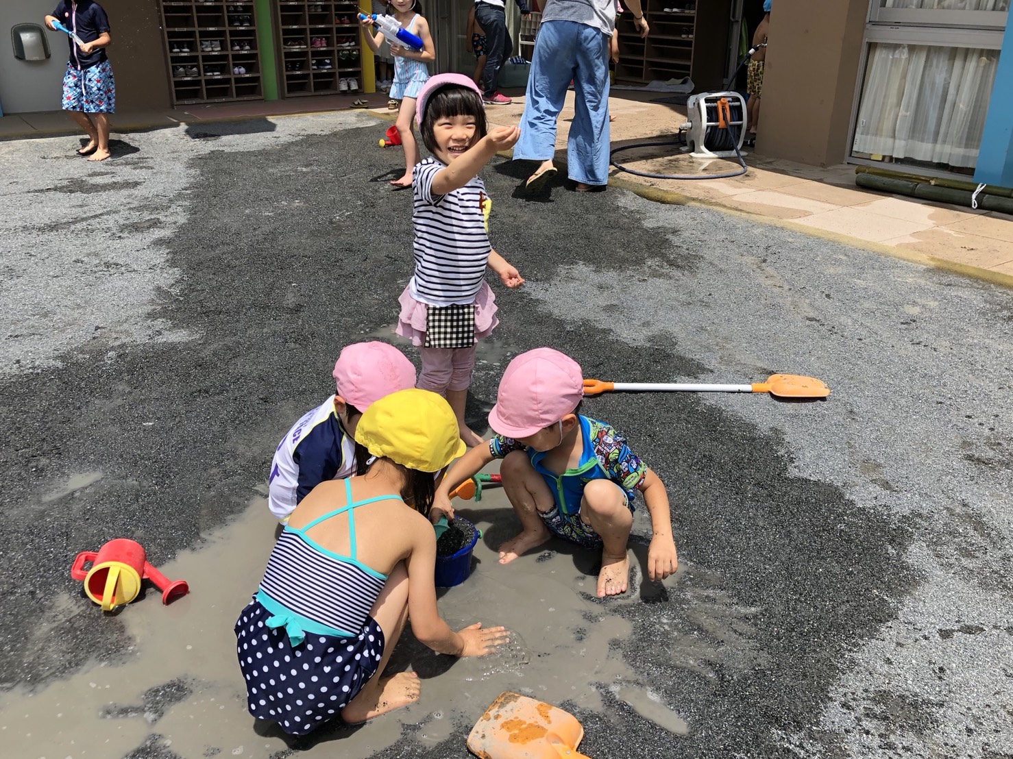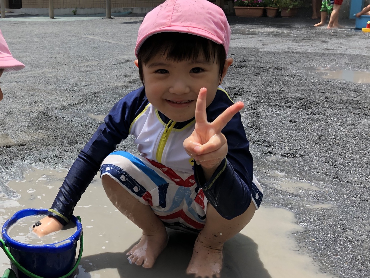 水遊び 今日のひとこま 2018.06.28 今日はお弁当をいただいたあと、水着に着替えてお外で水遊びをしました。 今日はとても暑かったので、つめたい水にふれて気持ち良さそうでした。 泥んこになって遊んで楽しかったですね。